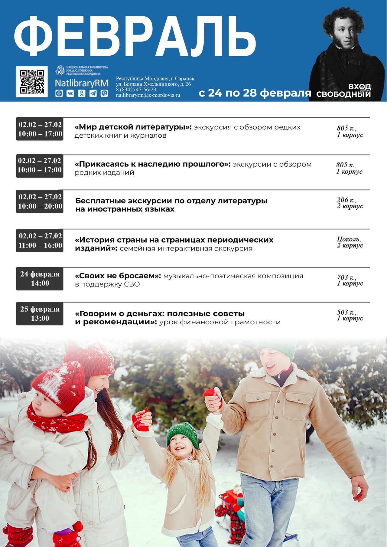 12 января - 25 декабря Место и время проведения: ГБУК «Национальная библиотека им. А. С. Пушкина Республики Мордовия», г. Саранск, ул. Б. Хмельницкого, д. 26, Читать далее
