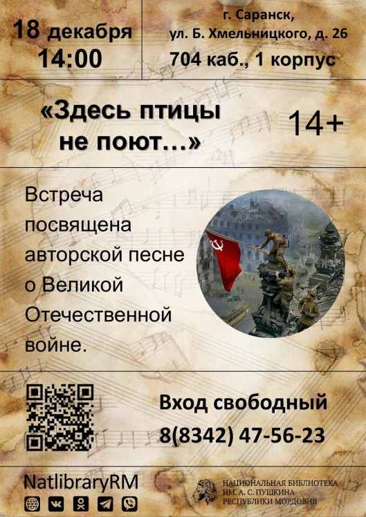 Национальная библиотека им. А. С. Пушкина Республики Мордовия приглашает принять участие в республиканской сетевой акции «История работы библиотек Мордовии в годы Великой Отечественной войны 1941–1945 гг.», посвященной 80-летию Победы. Координатором акции выступает отдел научно-исследовательской и методической работы. Цели акции – активизация работы библиотек в области патриотического воспитания и повышение качества … Читать далее