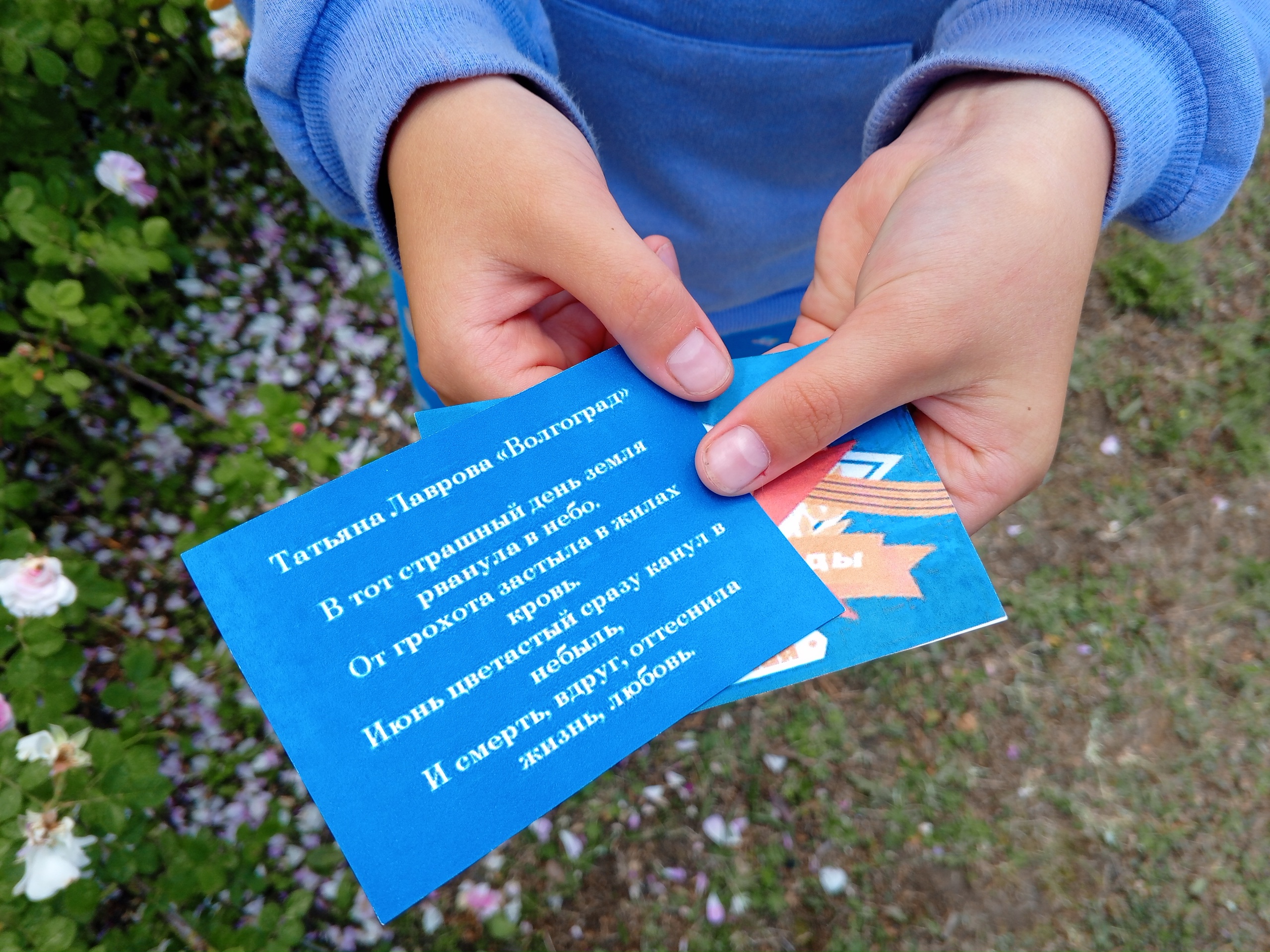 Участникам акции раздали листовки с отрывком из пронзительного стихотворения Татьяны Лавровой «22 июня» и пригласили посетить выставку в отделе литературы по искусству «Тот самый длинный день в году…».