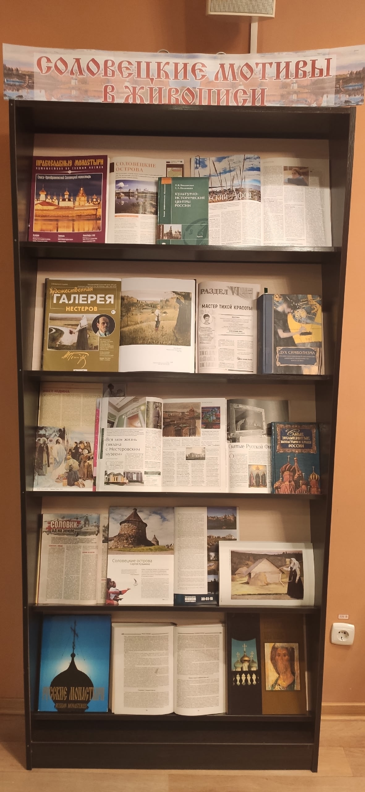 К встрече была подготовлена книжная выставка «Соловецкие мотивы в живописи», знакомящая с полотнами русских художников, художественными и фотоальбомами.
