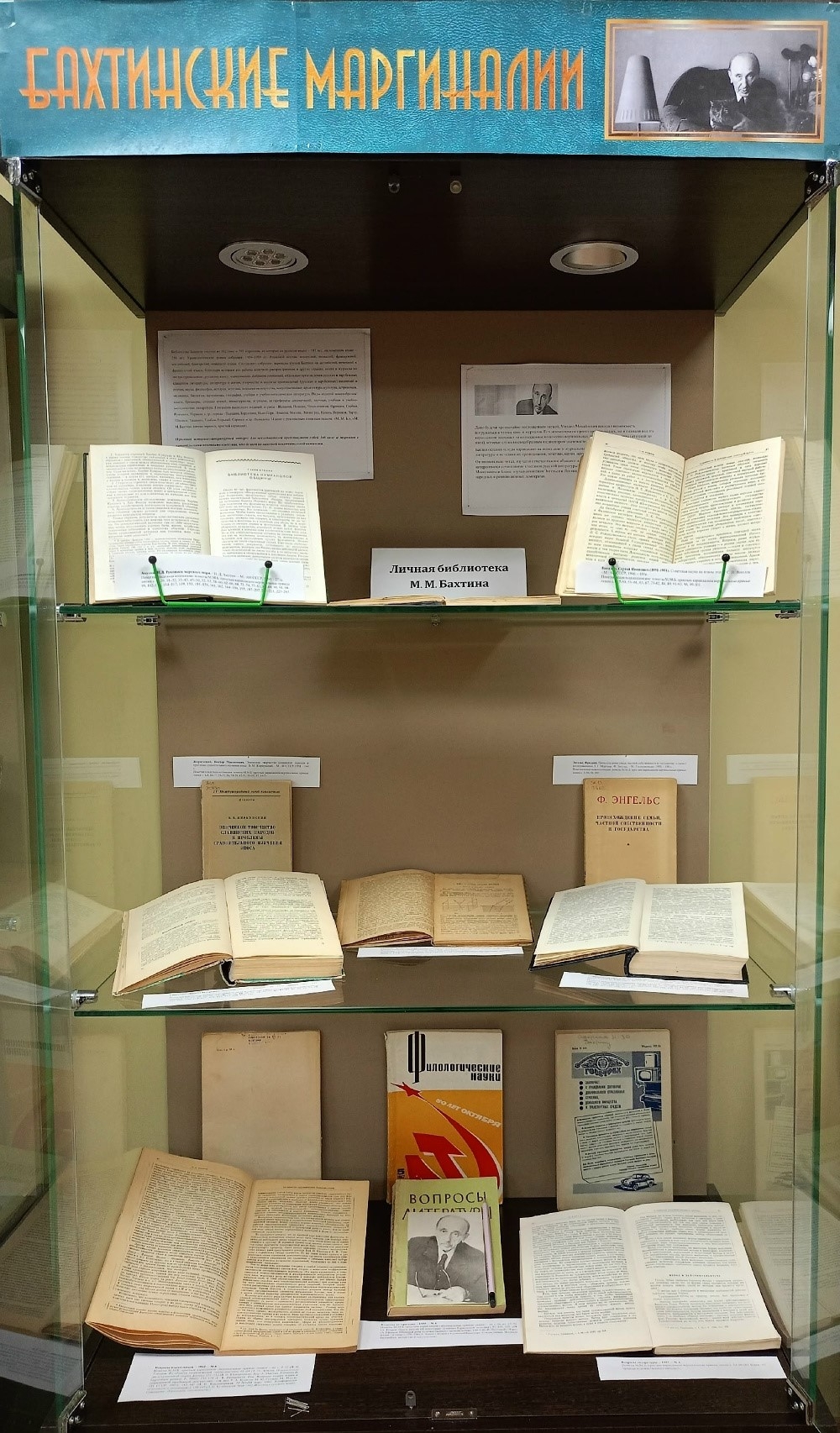 Экспозиция предлагает ознакомиться с книгами и журналами с одной отличительной чертой – карандашными пометами ученого на полях (вертикальные прямые линии), которые служат не только свидетельством его читательского внимания, но и ценнейшими первоисточниками. Они раскрывают глубину его научной деятельности и его интересы, позволяют глубже понять исторические, общественно-политические, эстетические и другие грани его мировоззрения.