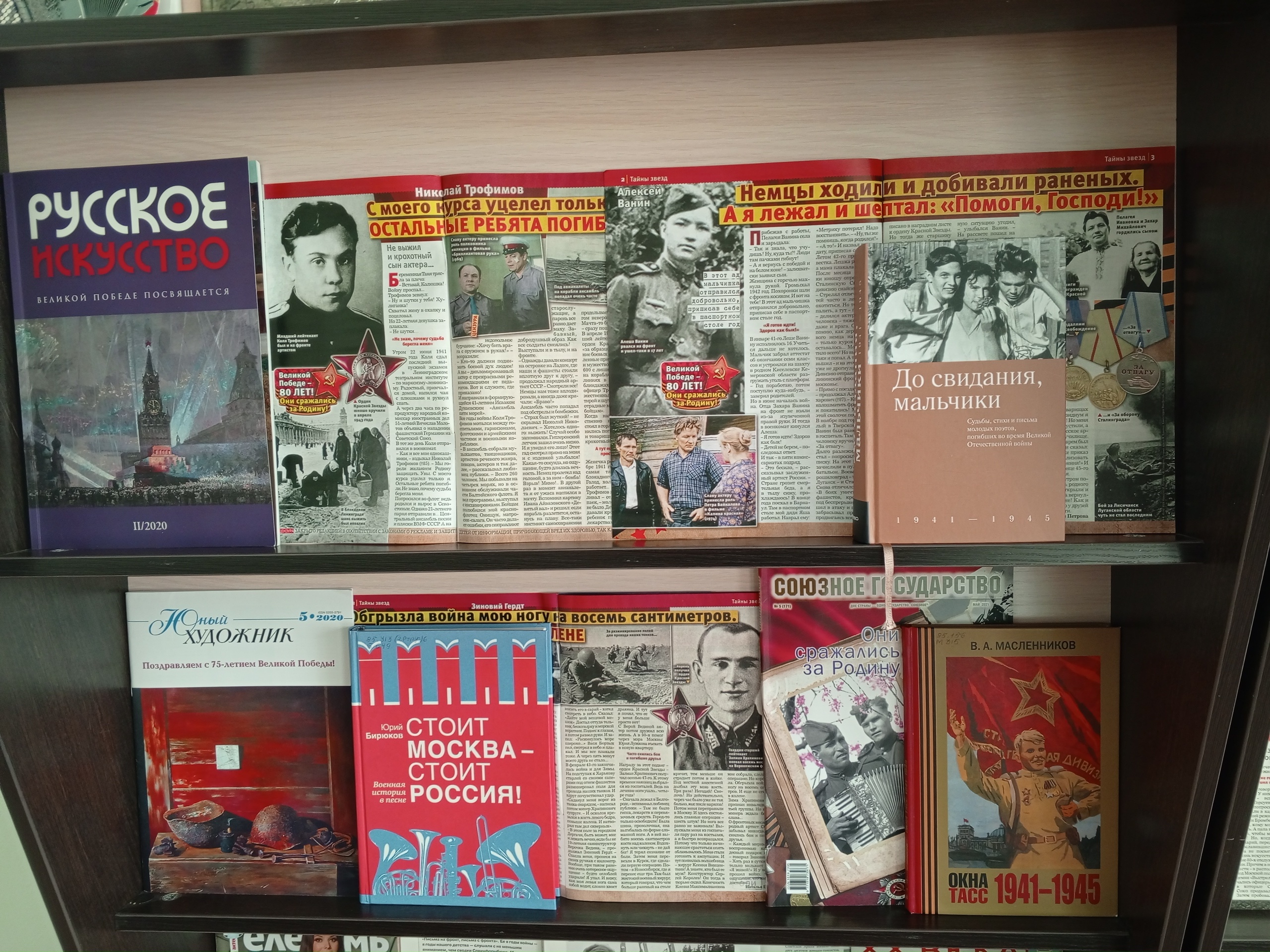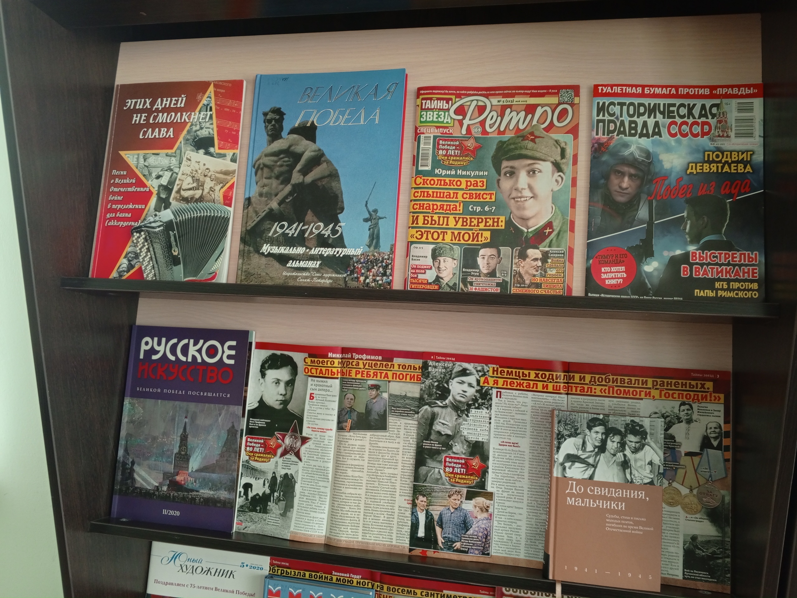 Экспонируются книги: музыкально-литературный альманах «Великая Победа. 1941–1945», «Стоит Москва – стоит Россия! Военная история в песне» Ю. Е. Бирюкова, ноты: «День Победы: песни военных и послевоенных лет», «Песни, опаленные войной», «Этих дней не смолкнет слава», тематические выпуски журналов «Русское искусство», «Ретро», «Союзное государство», «Юный художник», посвященные Великой Отечественной войне.