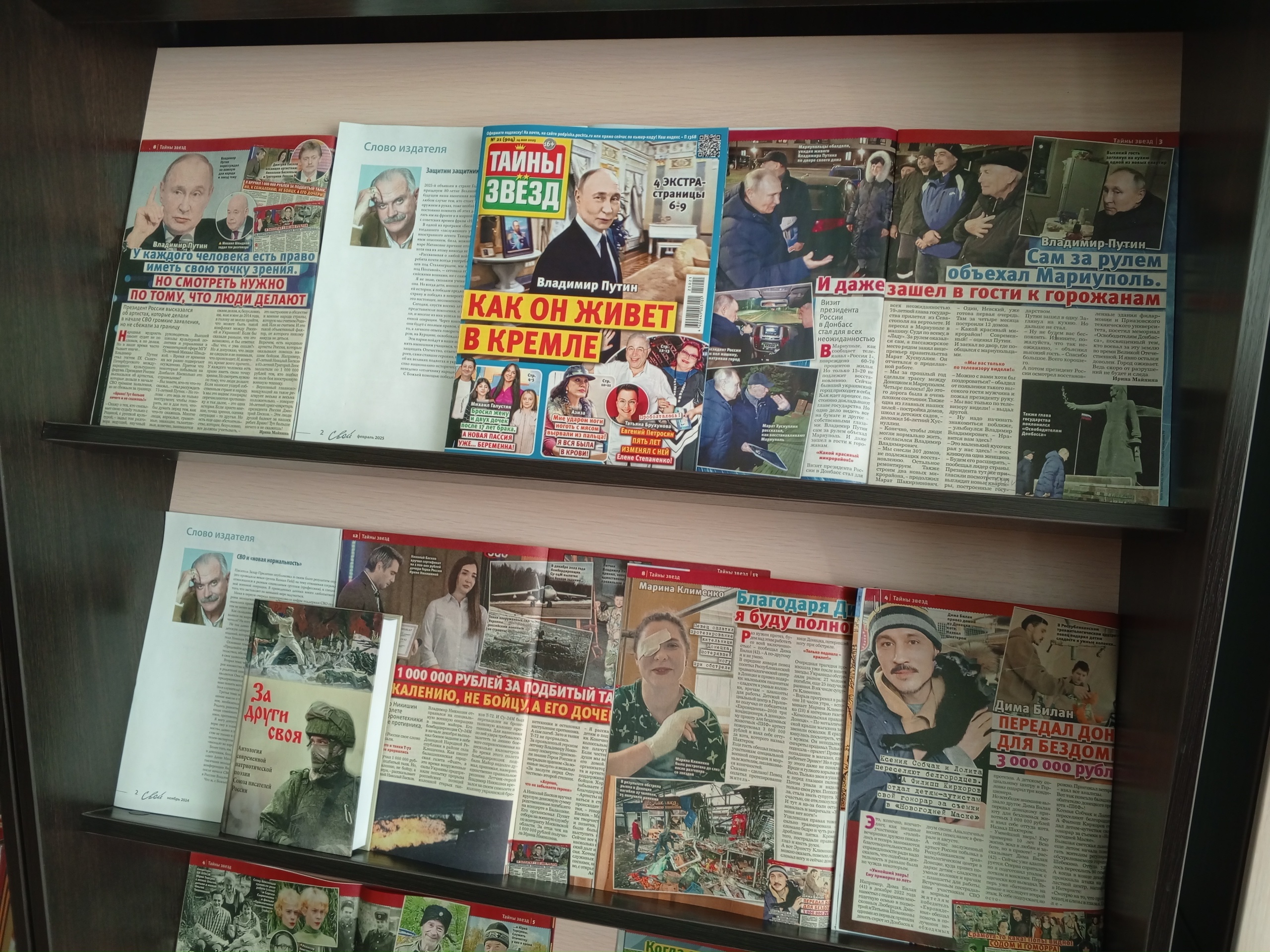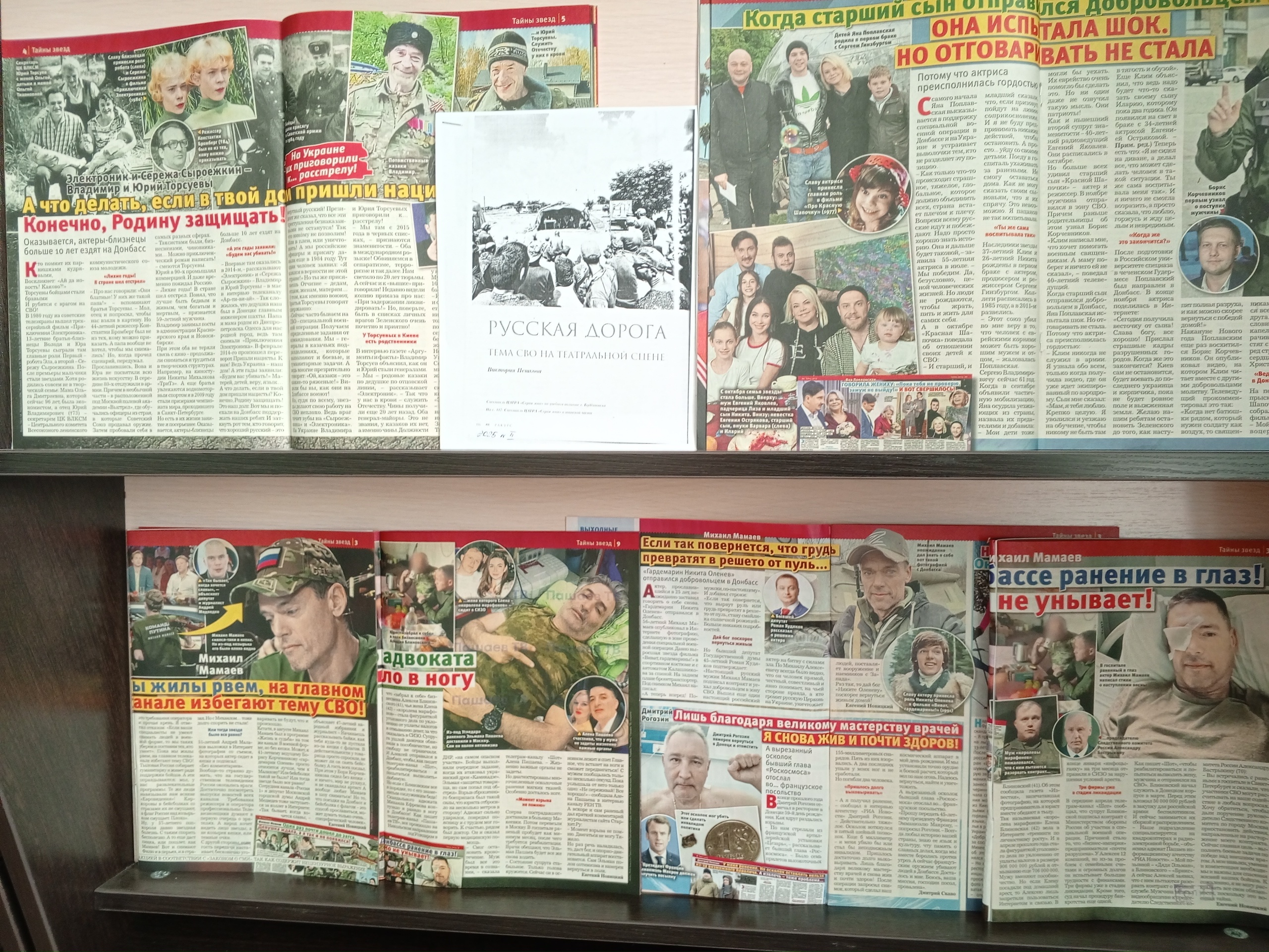 Выставка «Патриотизм: разговор о главном» посвящена специальной военной операции (СВО) – самой важной реалии сегодняшней России, и нашим современникам, которые откликнулись на драматические события последних лет. Экспонируются статьи из журналов «Свой», «Тайны звезд» и др., в которых освещается позиция российских политиков и общественных деятелей – президента РФ В. В. Путина, пресс-секретаря президента РФ Д. С. Пескова, режиссера Н. С. Михалкова и др., участие российских актеров, певцов, музыкантов непосредственно в СВО, а также организация ими гуманитарной помощи защитникам и мирным жителям, среди них И. Охлобыстин и его семья, Д. Билан, Н. Басков, М. Мамаев и др.