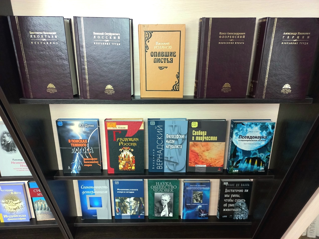 Представлены издания по истории философии, а также труды выдающихся мыслителей всех эпох: Аристотеля, Сократа, Платона, Гёте, Конфуция. Один из разделов выставки посвящен русской философии – трудам П. Флоренского, Н. Бердяева, В. Соловьева, К. Леонтьева, В. Розанова и других мыслителей.
