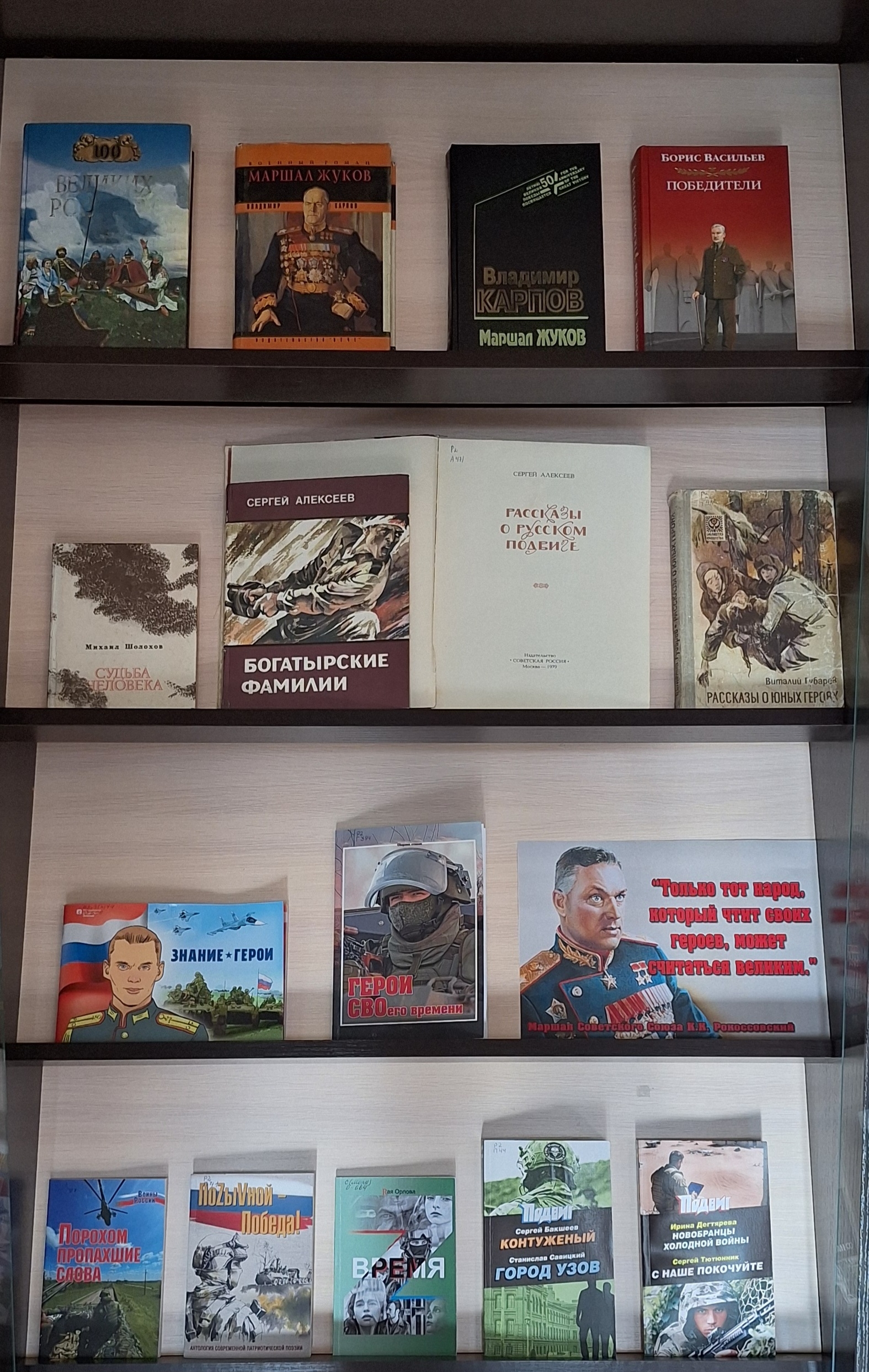 Экспонируемые книги помогут вам стать «очевидцами» прошлого, проникнуть в разные исторические эпохи Российского государства, расскажут о выдающихся соотечественниках, великих полководцах, помогут вспомнить тех, кто «делал» историю. Представлена также художественная литература о героях нашего времени – участниках специальной военной операции.