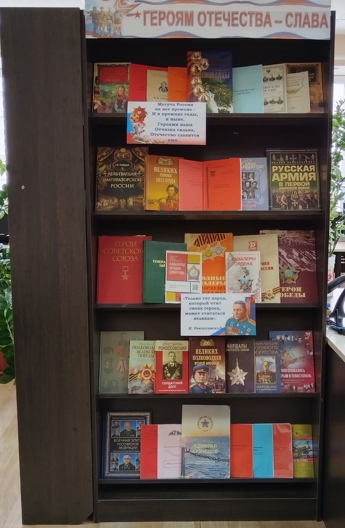 Приближается 80-летие победы в Великой Отечественной войне (1941–1945 гг.). К этому событию в отделе информационно-библиографического обслуживания оформлена книжная выставка «Героям Отечества – слава» (305 к., 1 корпус).
