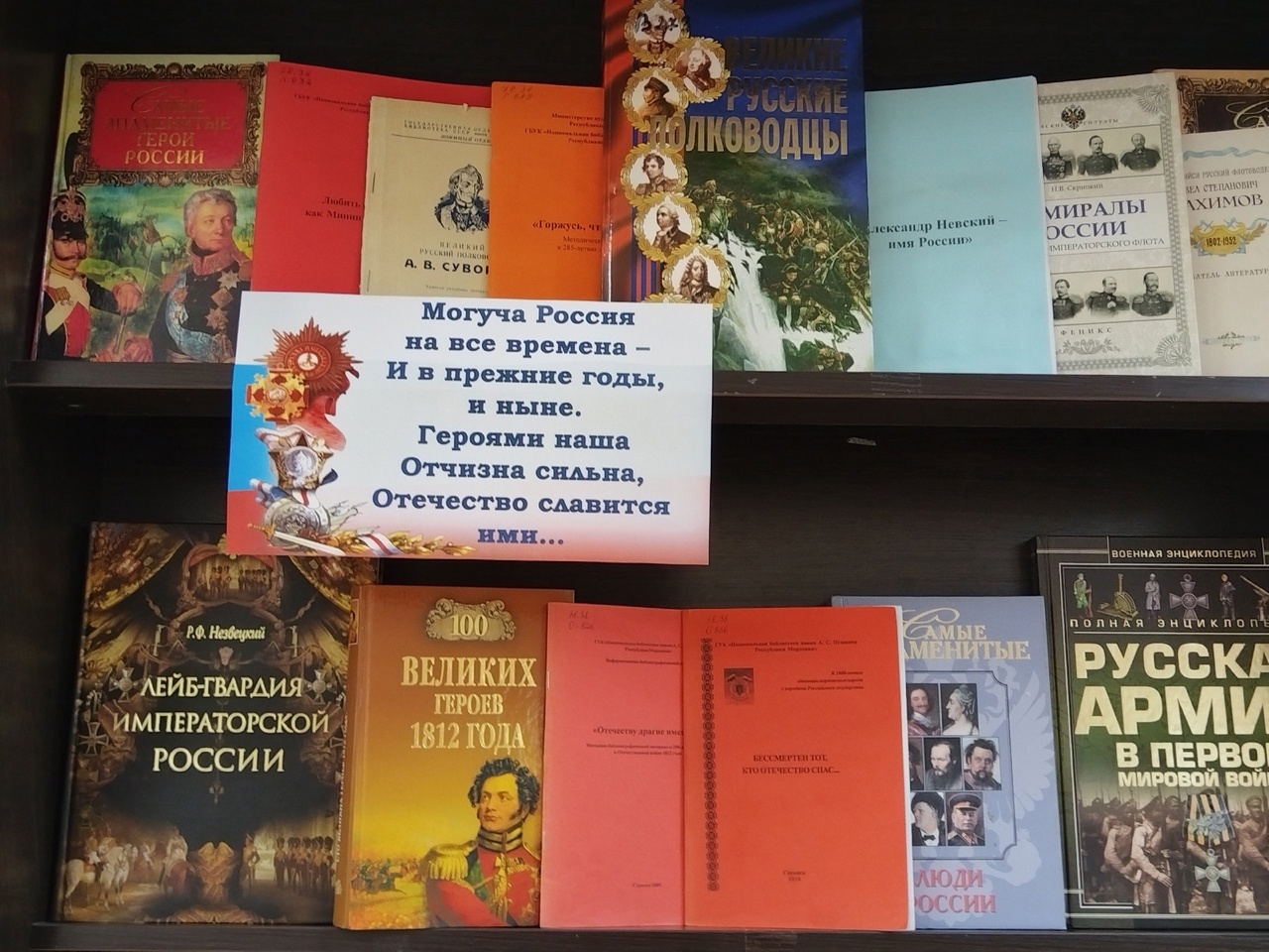 Представленные на выставке книги расскажут о защитниках Древней Руси, о героях Первой мировой войны, героях и полководцах периода Великой Отечественной войны, которые стали символами мужества и стойкости, раскроют лучшие черты характера русского воина, истоки его бесконечной любви к Родине.