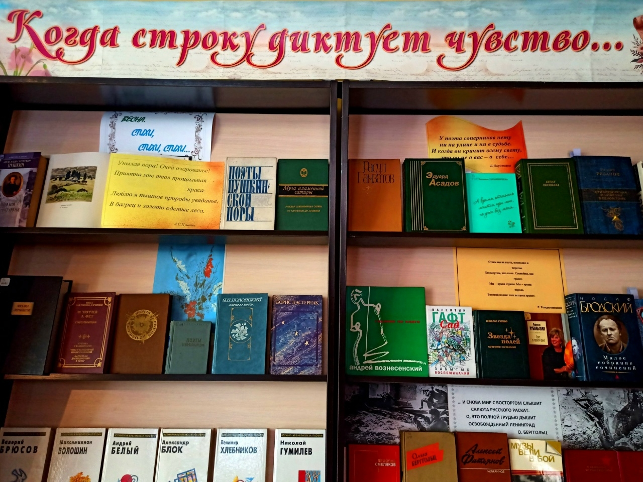 В отделе гуманитарной литературы (405 к.) работает книжно-иллюстративная выставка-просмотр «Когда строку диктует чувство…», посвященная Всемирному дню поэзии. День поэзии – это особый праздник, когда мы вновь вспоминаем о невероятной силе слова, его способности трогать самые глубокие струны души, вдохновлять, утешать и заставлять задуматься.