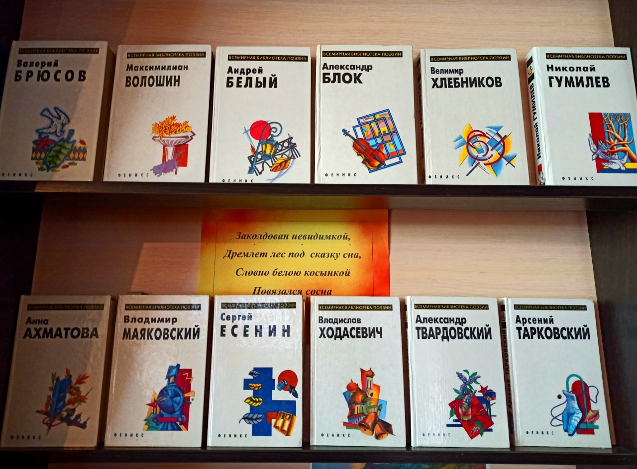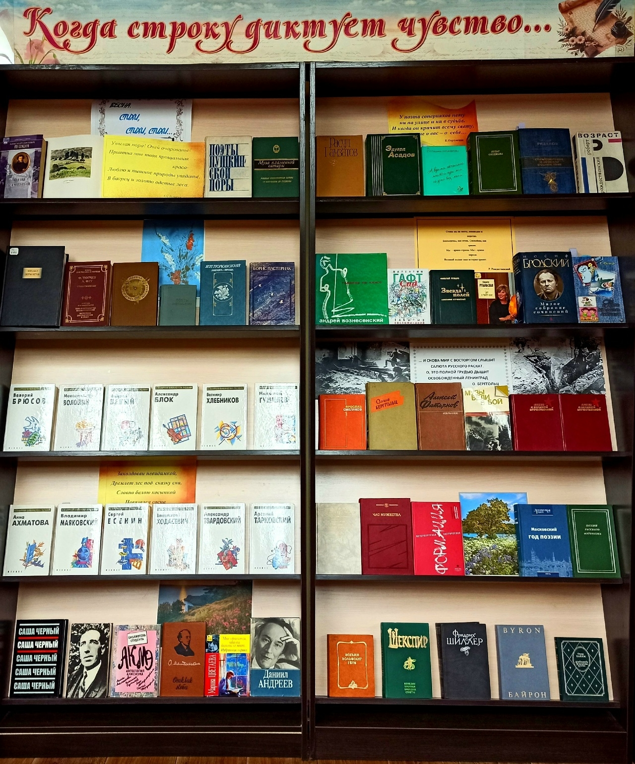 Представленная выставка познакомит посетителей со стихами любимых классиков: гениальными строками Пушкина и Лермонтова, глубокой мудростью Тютчева и Фета, яркой самобытностью и новаторством поэтов Серебряного века – Блока, Есенина, Ахматовой, Цветаевой и Маяковского, а также с сонетами Шекспира и лирикой Гёте, глубоким психологизмом Байрона. Актуально и остро звучат голоса поэтов в представленных сборниках стихов, посвященных Великой Отечественной войне.