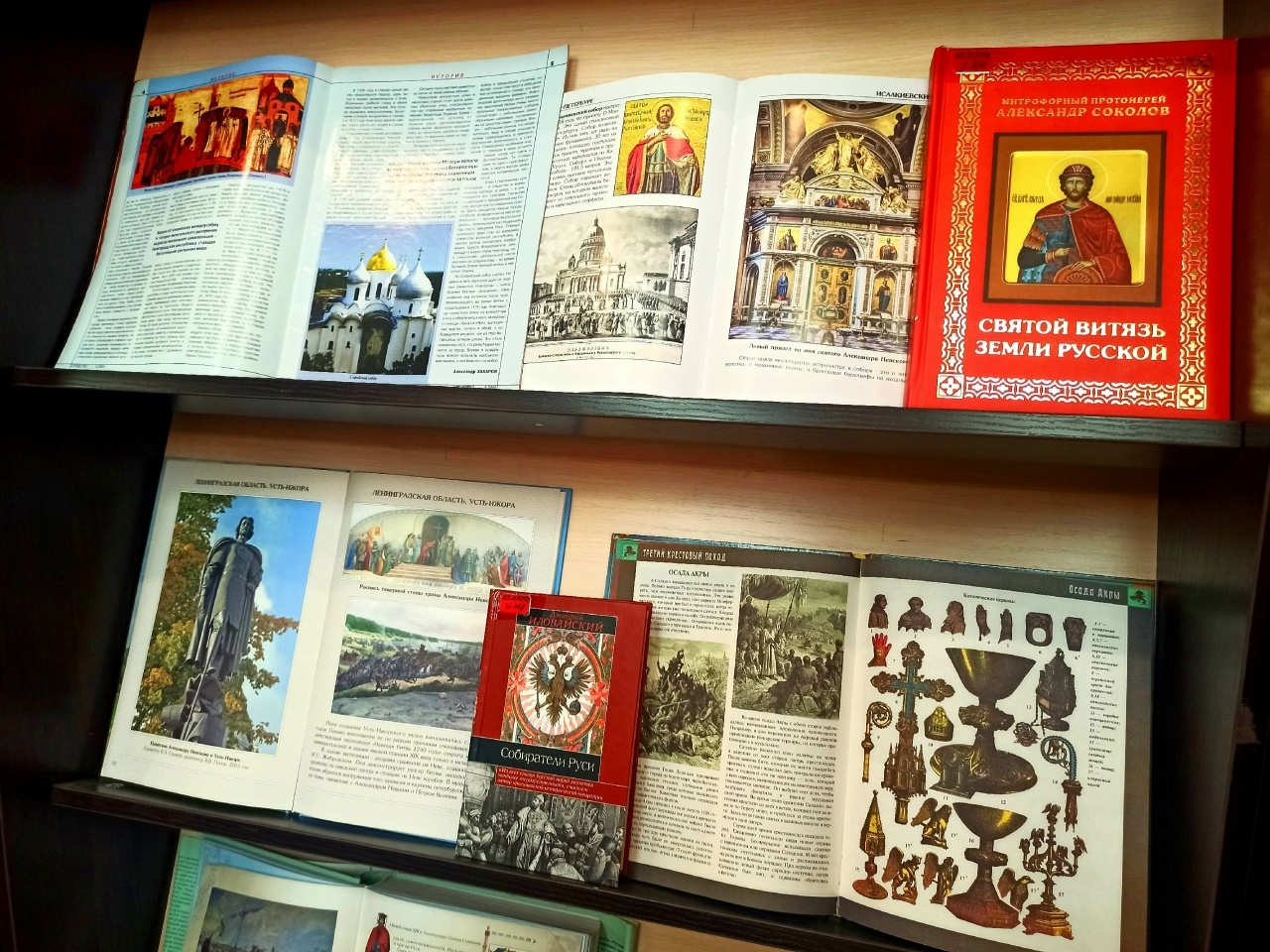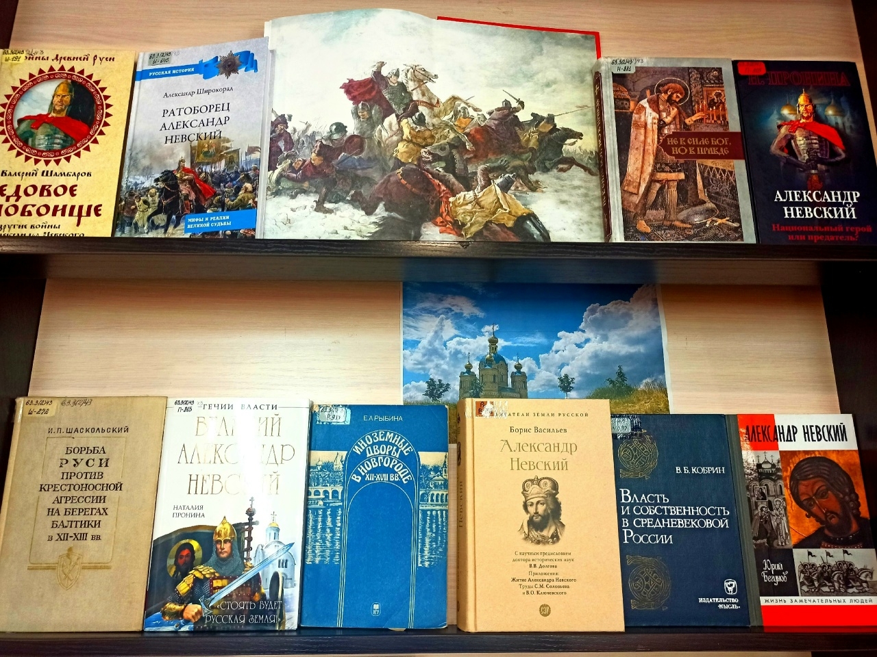На выставке представлены издания, исторические материалы о жизни князя Александра Ярославича, книги по истории Руси в период его правления, а также о битве на Чудском озере.