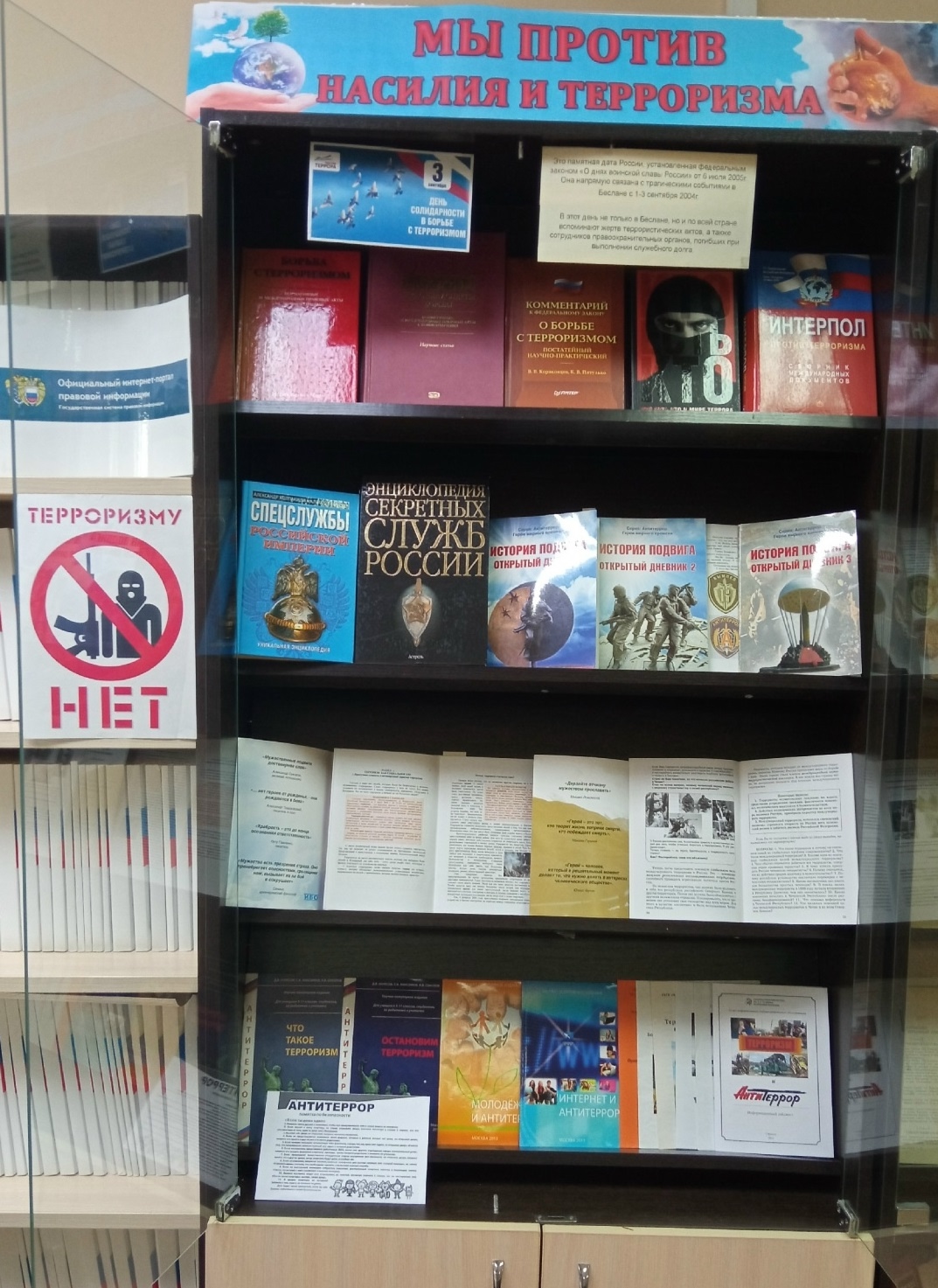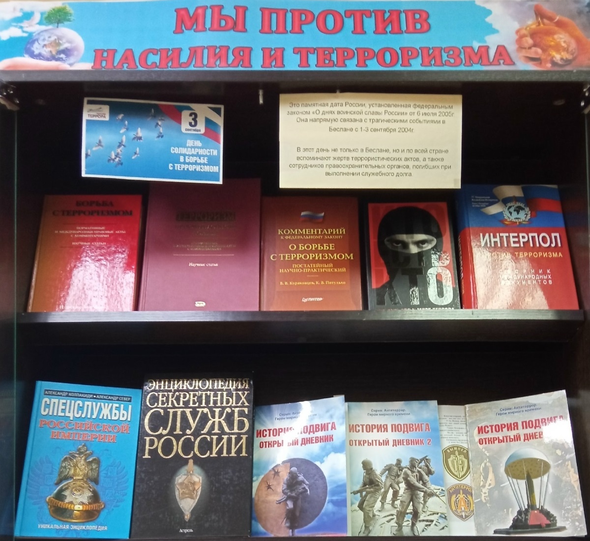 В отделе информационно-библиографического обслуживания работает книжно-иллюстративная выставка «Мы против насилия и терроризма».
