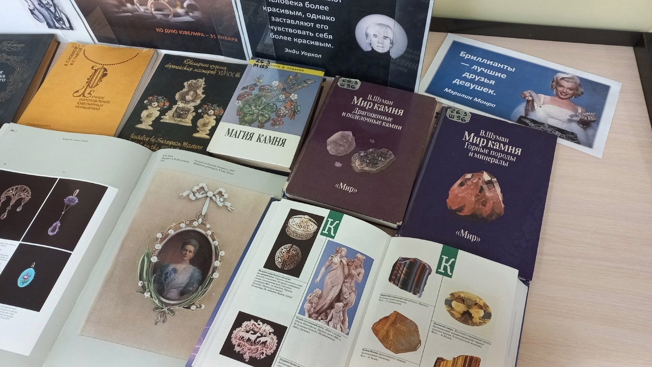 Если обратить внимание на сегодняшние дни, то, конечно, люди стали по-иному относиться к минералам и металлам: начали выделять драгоценные камни и металлы, появилось множество профессий, связанных с их добычей, переработкой и обработкой, одна из которых – ювелир. 31 января люди этой профессии отмечают свой праздник – День ювелира. К этой дате сотрудники отдела естественнонаучной и производственной литературы подготовили книжный развал «От авантюрина до яшмы». Предлагаемая экспозиция поможет ближе познакомиться с богатым и завораживающим миром камней, драгоценных изделий и даже научит понимать, разбираться в их.