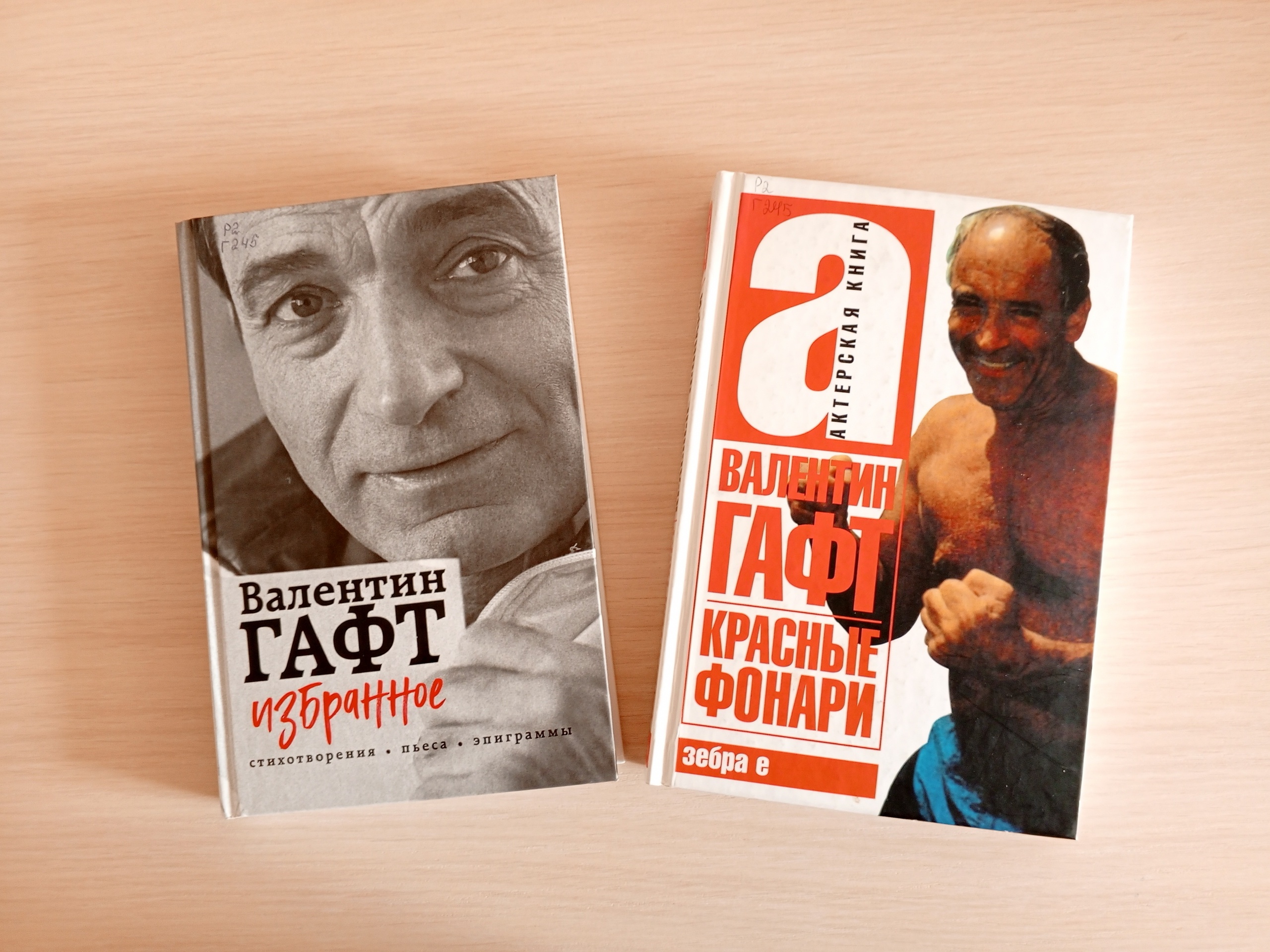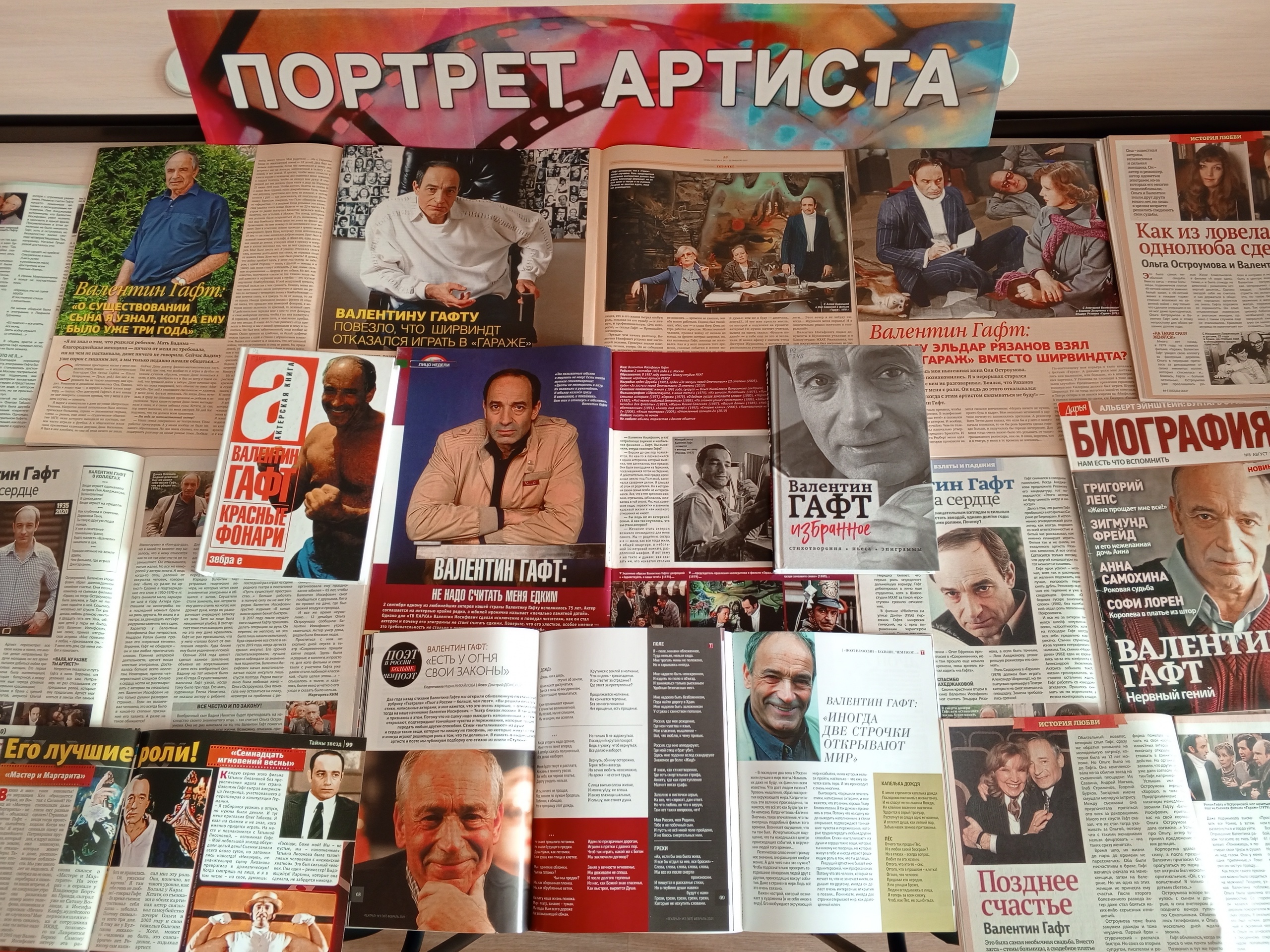 Однако В. Гафт – не только яркий актер театра и кино, но и самобытный писатель, который создал сотни стихотворений, эпиграмм и посвящений коллегам. На выставке представлены две его книги. В сборник «Избранное» вошли стихотворения, пьесы, эпиграммы, воспоминания о себе и друзьях, а также пьеса «Мне снился сон». Книга «Красные фонари» содержит известные стихотворения и эпиграммы, а также поэтические циклы «Красные фонари» и «Локарно».