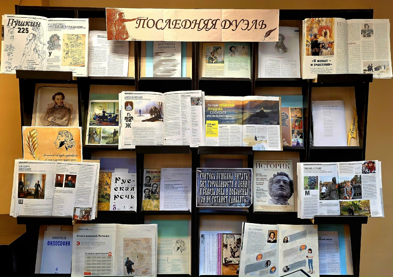 Сотрудники отдела периодических изданий (110 к., 2 корпус) подготовили выставку-просмотр «Последняя дуэль». Экспозиция посвящена печальной годовщине дуэли А. С. Пушкина и представлена периодическими изданиями, которые рассказывают о жизни великого поэта, его семье, друзьях, важнейших событиях жизни и творчества и помогают острее прочувствовать трагизм того далекого зимнего дня.