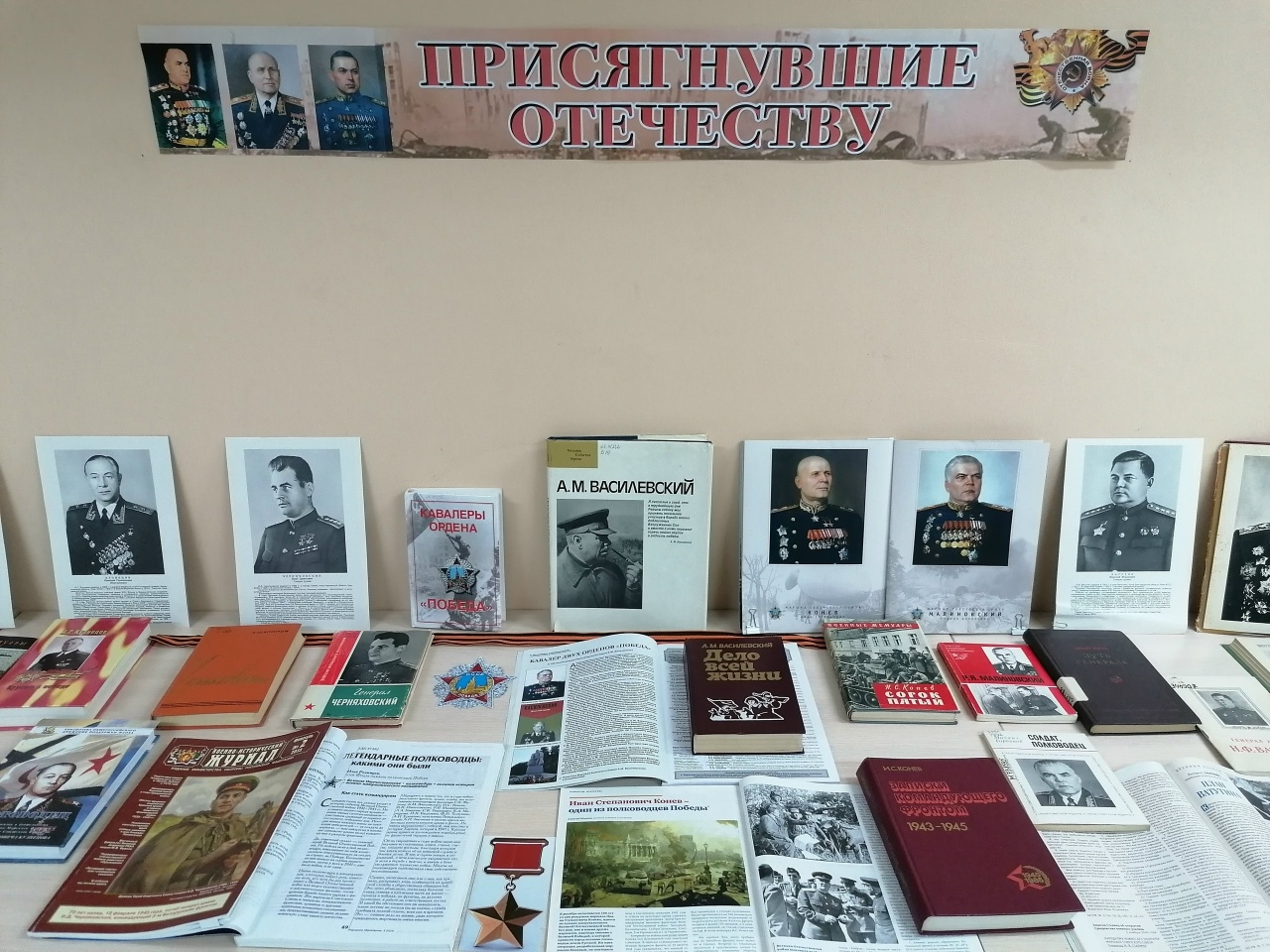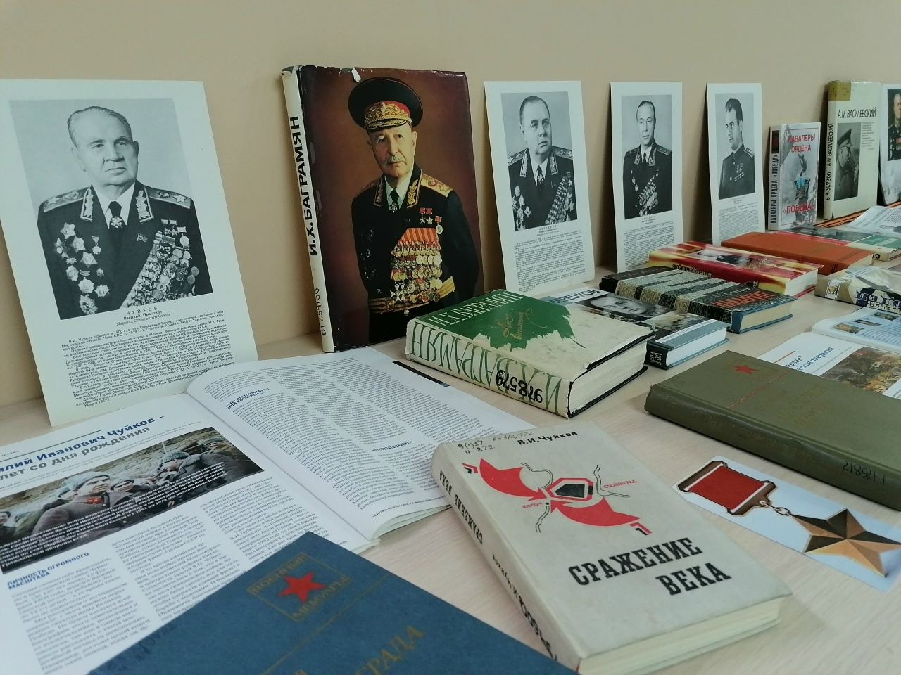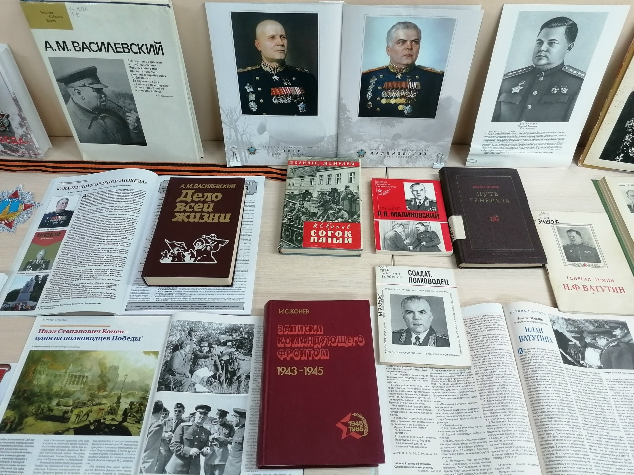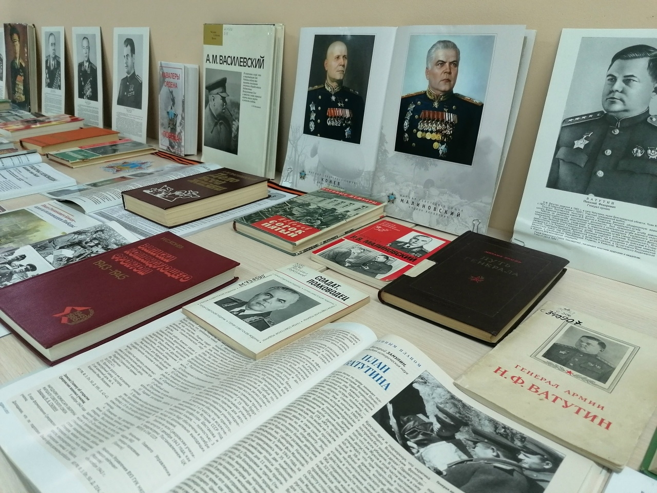 В экспозиции представлена документальная и мемуарная литература, раскрывающая жизненный путь и становление известных военачальников; особенности их военного искусства и вклад в разгром врага; личные качества, проявившиеся в годы испытаний. Среди изданий: А. М. Василевский «Дело всей жизни» (Минск, 1984), М. И. Хаметов «Адмирал А. Г. Головко» (Москва, 1977), М. Г. Брагин «Путь генерала» (Москва, 1953), Н. Г. Кузнецов «Курсом к победе» (Москва, 2000) и др.