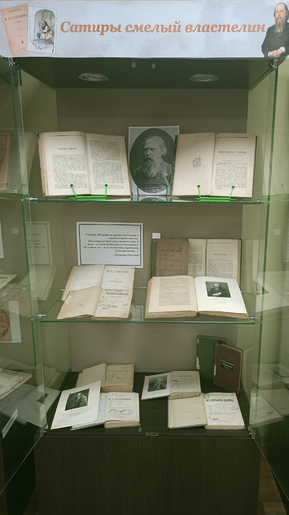 В честь юбилея писателя в отделе редких книг и работы с книжными памятниками (805 к.) работает экспозиция редких изданий, в которых он выступает как виртуоз гротеска и смелый экспериментатор с жанрами. На выставке представлены прижизненные публикации произведений великого сатирика: «Пошехонская старина», «Пестрые письма», «Мелочи жизни», «Счастливец», опубликованные в журналах «Вестник Европы» (1884–1889), отдельно изданные произведения «Круглый год» (1883) и «Пошехонские рассказы» (1885), посмертные издания Салтыкова-Щедрина, а также критическая литература о его произведениях.