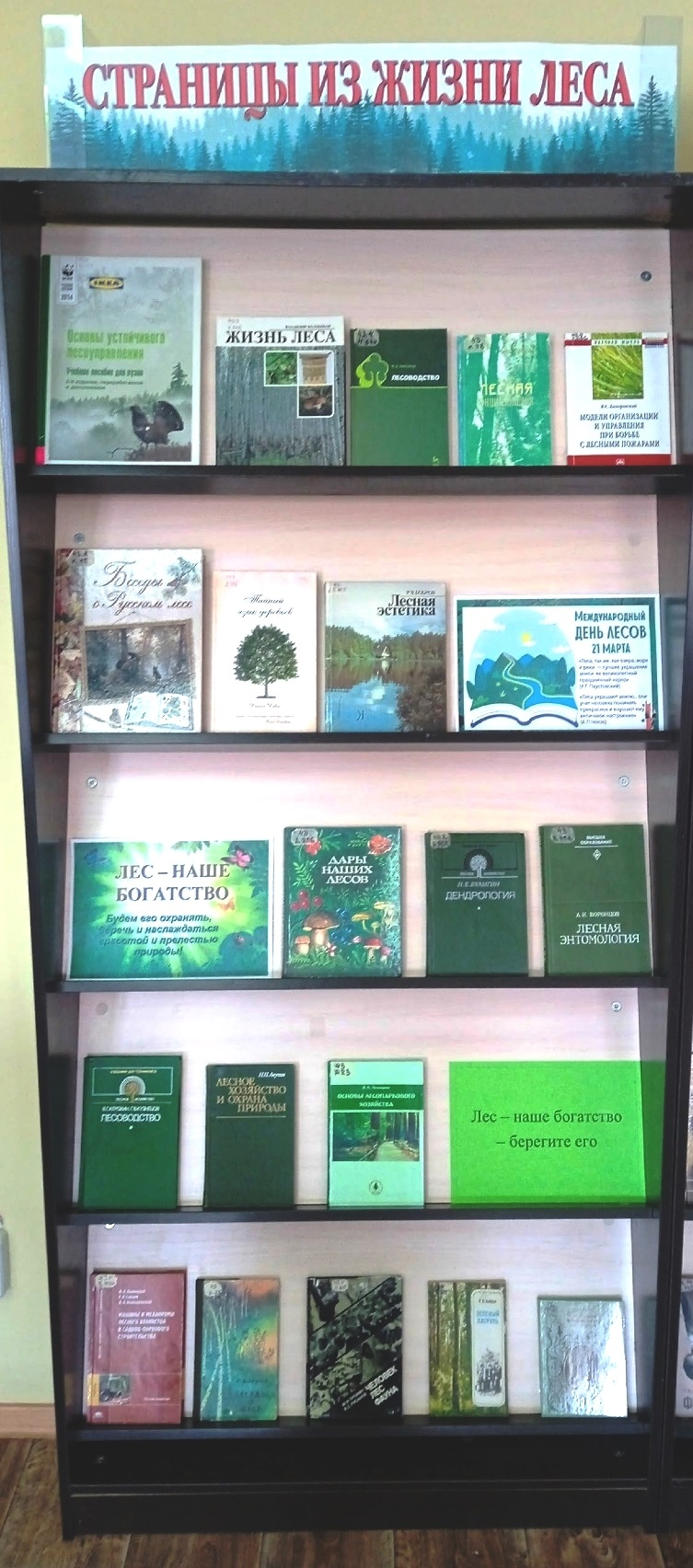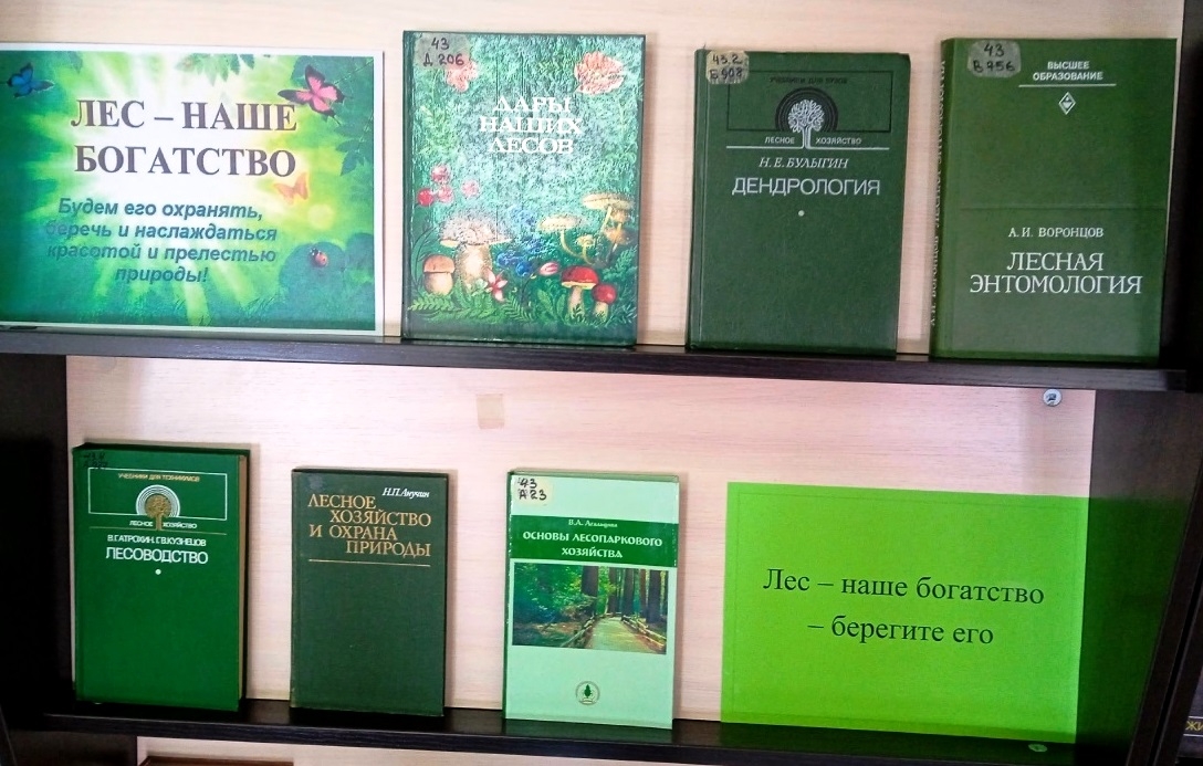 К этой дате в отделе естественнонаучной и производственной литературы подготовлена книжная выставка «Страницы из жизни леса». На выставке представлены издания, посвященные проблеме сохранения лесов и его богатств, значимости лесных экосистем, а также основным мерам защиты (от пожаров, незаконной вырубки, природных катастроф, воздействия насекомых-вредителей) и восстановления. Кроме того, представлены книги, показывающие красоту и волшебство леса, его удивительную силу, эстетическую и благотворную мощь.