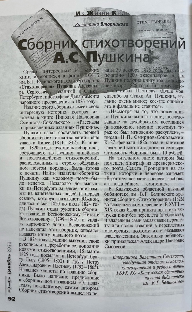 В экспозиции представлены познавательные статьи из журналов «Знание – сила», «Литература в школе», «Наука и религия», «Родина», «Смена», «Стратегия России», «Союзное государство», «Основы безопасности жизнедеятельности» и др., которые помогут лучше понять пушкинский мир; также представлены сборники стихотворений.