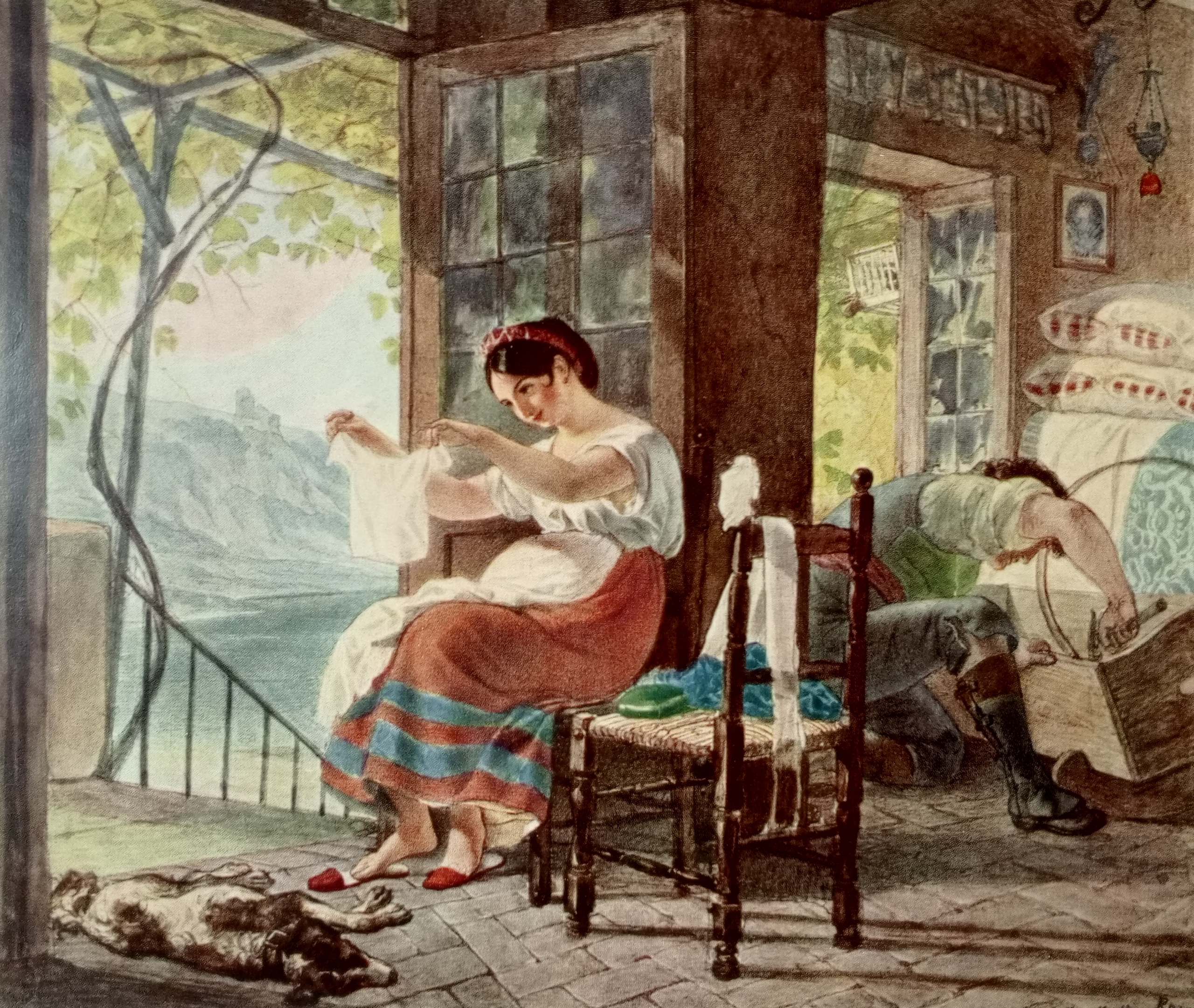 Обратим внимание на картину К. Брюллова «Итальянская семья в ожидании ребенка». Перед нами – просторная светлая комната, двери которой выходят на берег моря. Опору крыльца и перила лестницы обвивает виноград. Мужчина занят изготовлением колыбели для будущего малыша. На переднем плане – молодая женщина, ожидающая ребенка, разглядывает кофточку для новорожденного. Картина окутана уютом, теплом и светом, атмосфера которого поселилась в этом доме вместе с ожиданием новой жизни.
