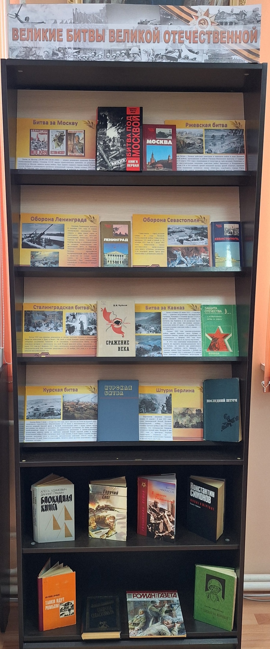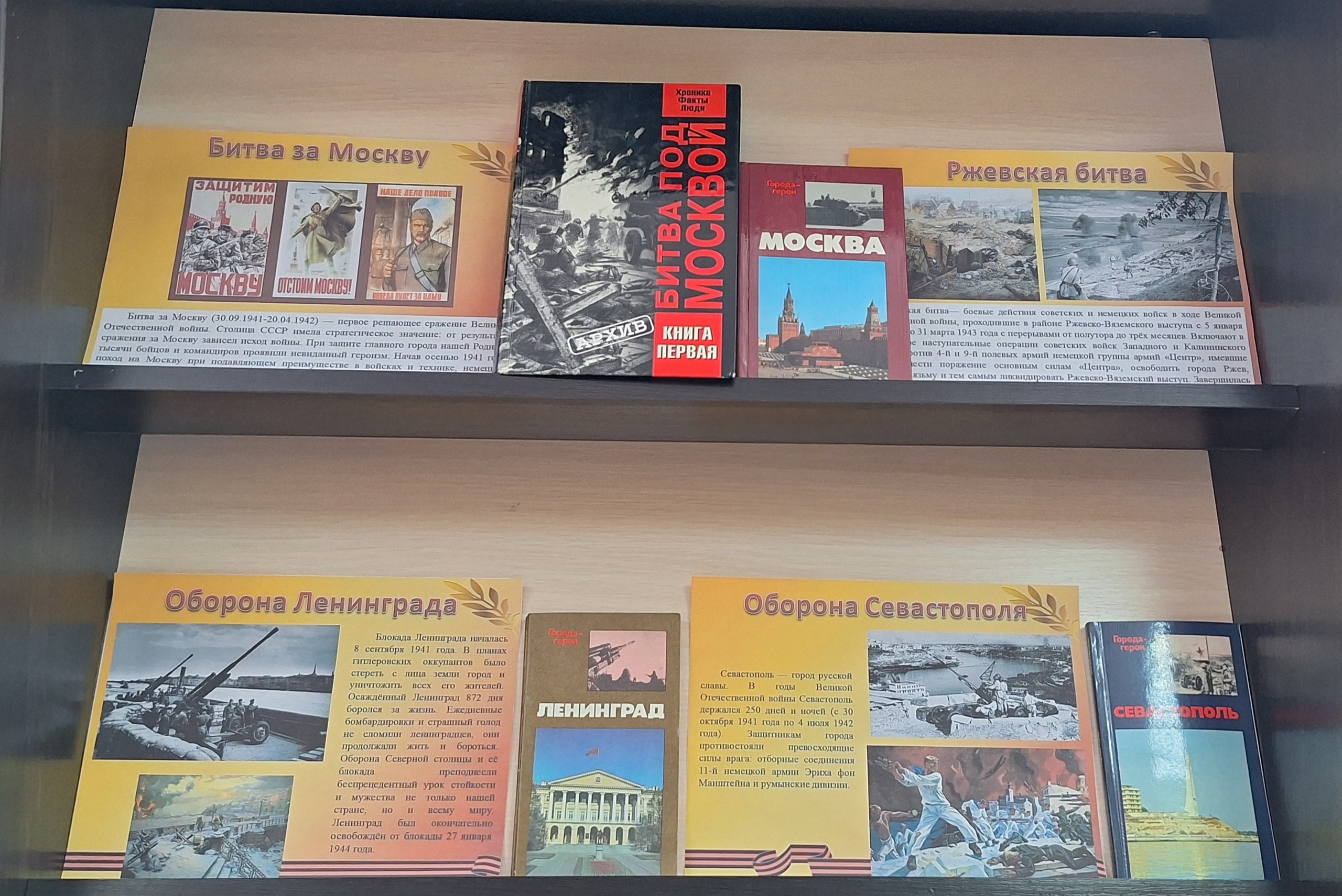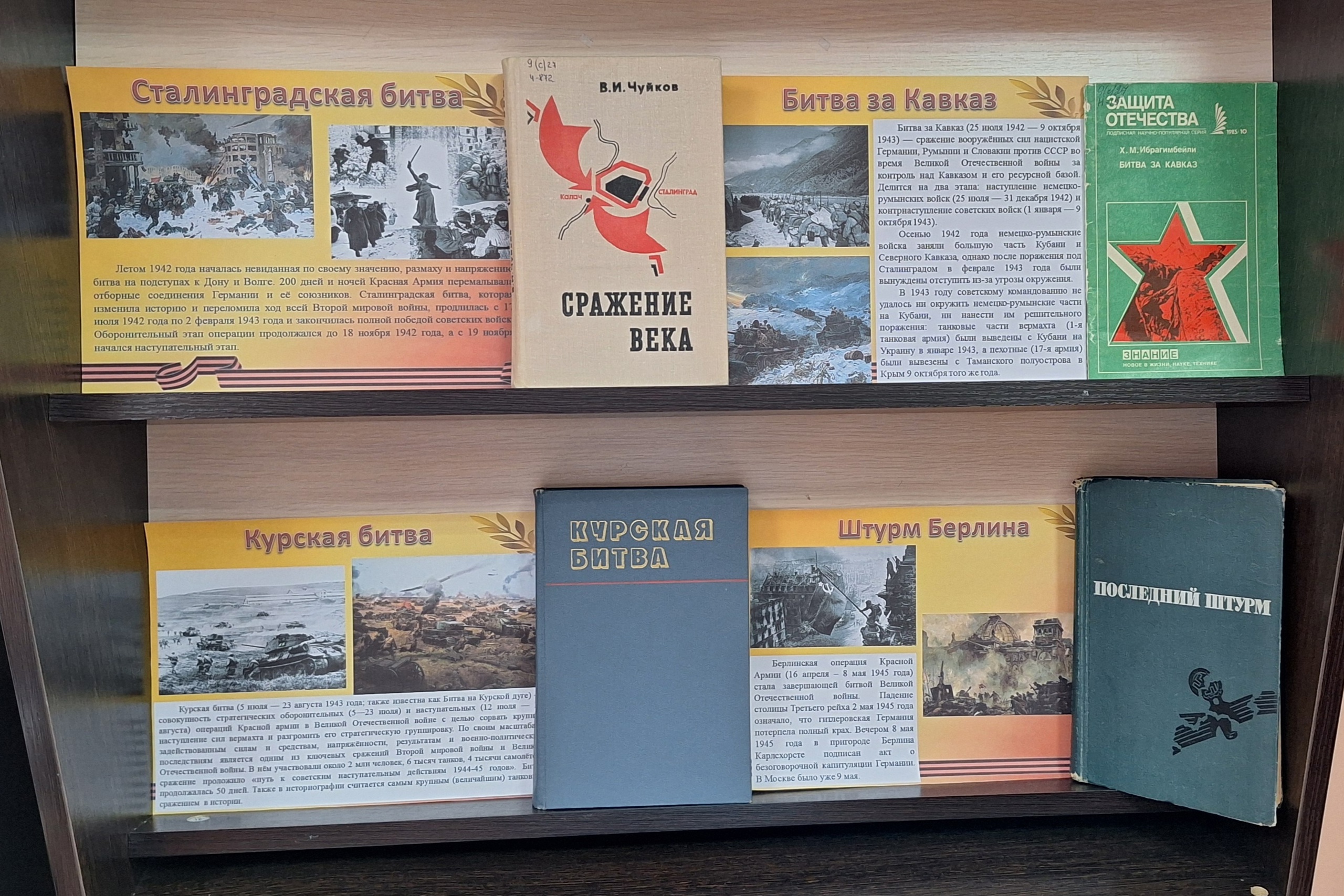 В год 80-летия Великой Победы отдел абонемента (109 к., 2 корпус) вспоминает великие битвы Великой Отечественной войны с помощью организованной выставки, на которой экспонируется публицистика о битвах за Москву, Сталинград и Кавказ, об обороне Ленинграда и Севастополя, о Курской битве и штурме Берлина. Также представлена художественная литература, посвященная сражениям Великой Отечественной войны.