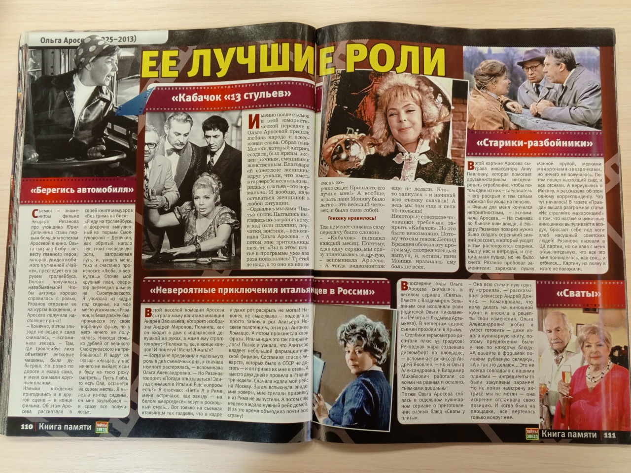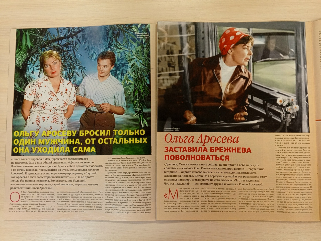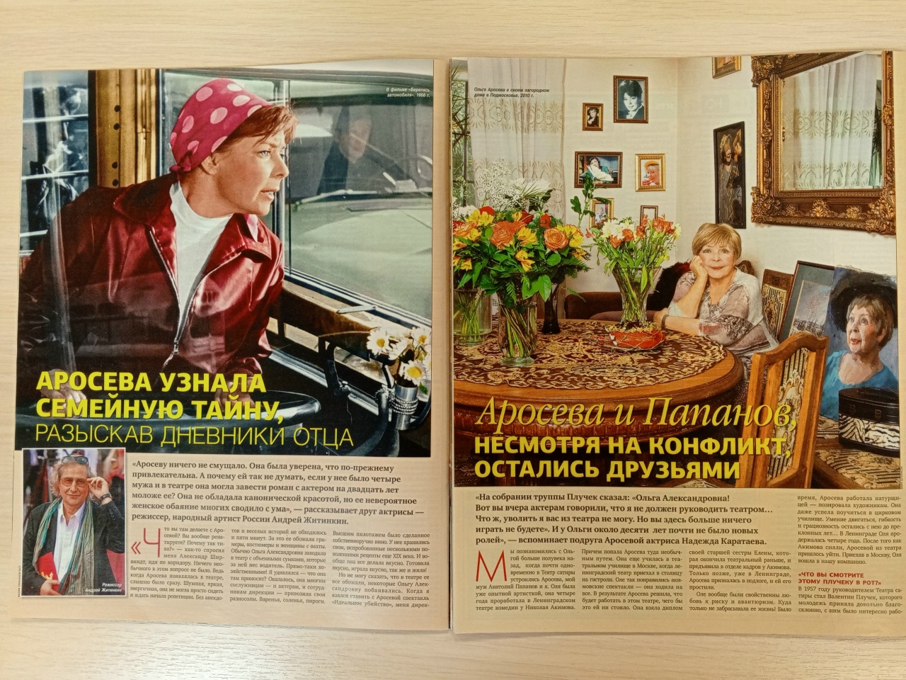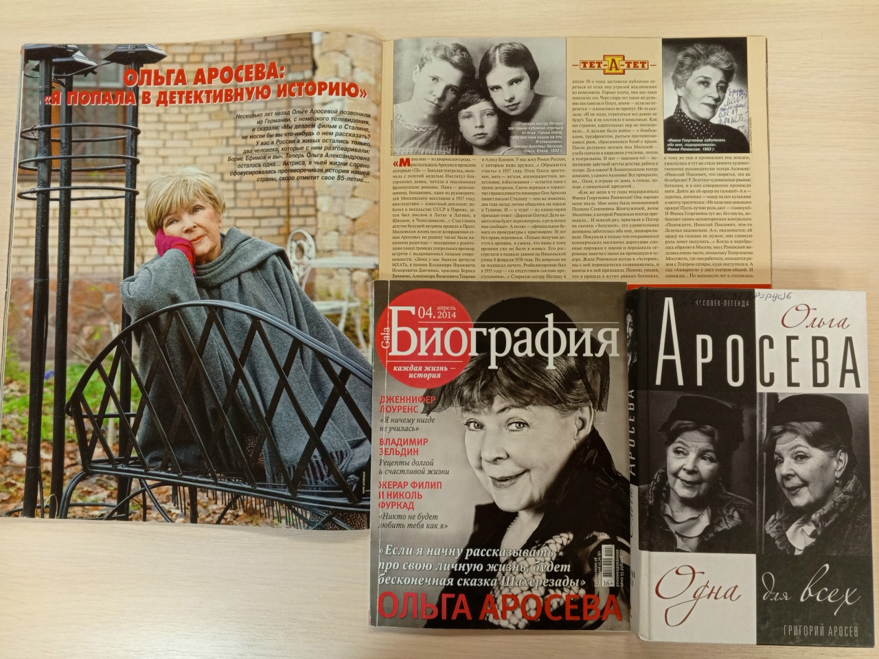 Поклонников заинтересует книга внучатого племянника актрисы – Григория Аросева «Ольга Аросева. Одна на всех», в которой он рассказывает о её происхождении, братьях и сестрах, годах учебы, её ролях и личной жизни. Интерес представляют интервью, взятые автором у друзей и коллег актрисы, а также впервые публикуемые многочисленные фотографии из личного архива.