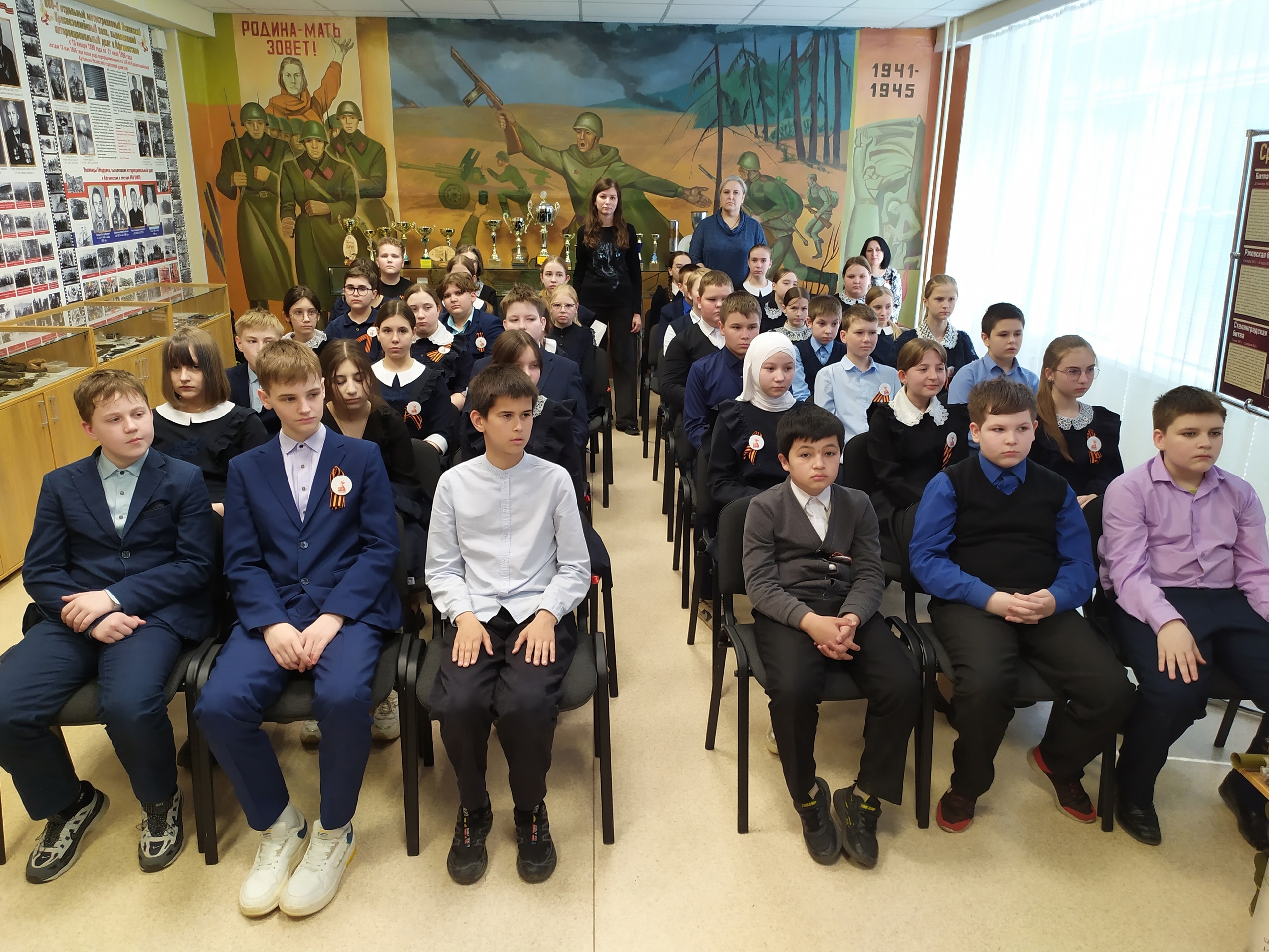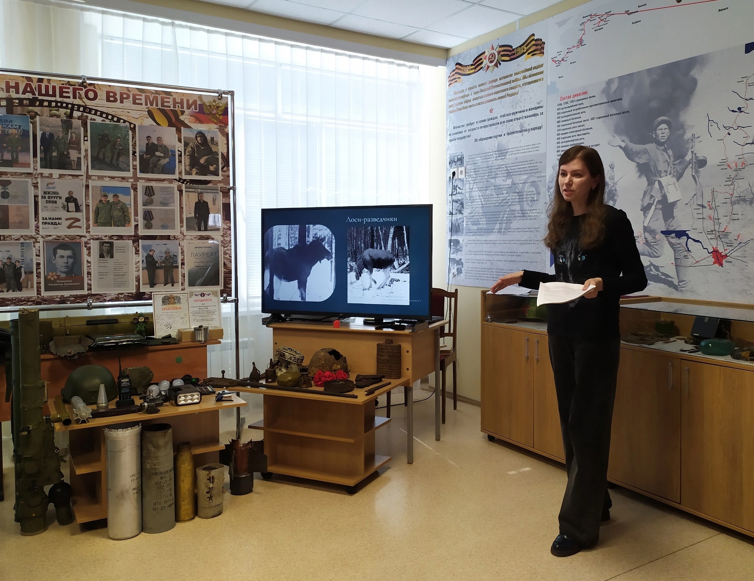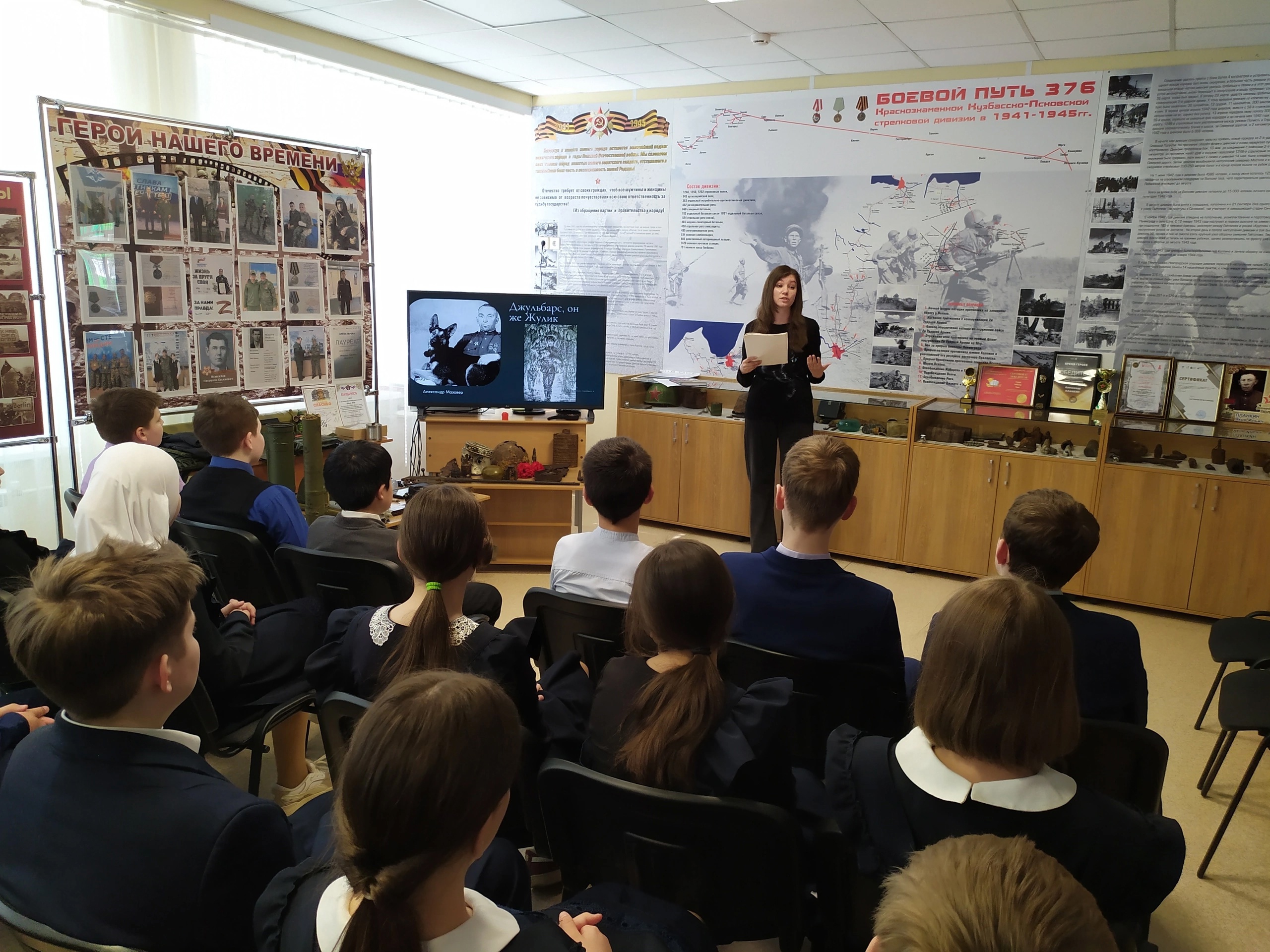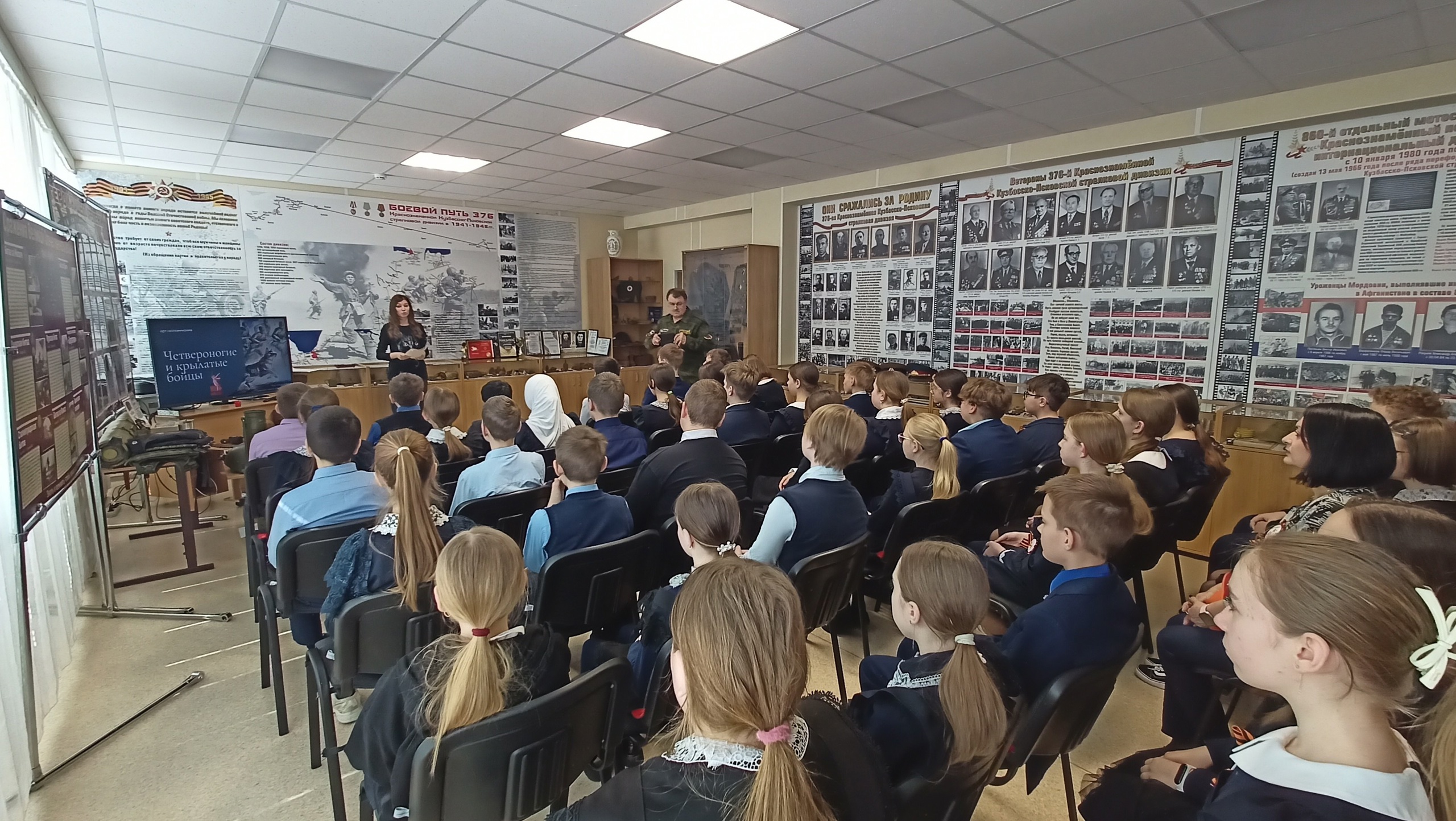 Присутствующие познакомились с памятниками, воздвигнутыми в память о животных и людях, сражавшихся плечом к плечу. В качестве дополнения к лекции учащимся продемонстрировали документальные видеоматериалы о Параде Победы, состоявшемся 24 июня 1945 года, отрывок фильма о героической обороне Заполярья. Также прозвучали занимательные факты об эрмиках, Ленинградском зоопарке и др.