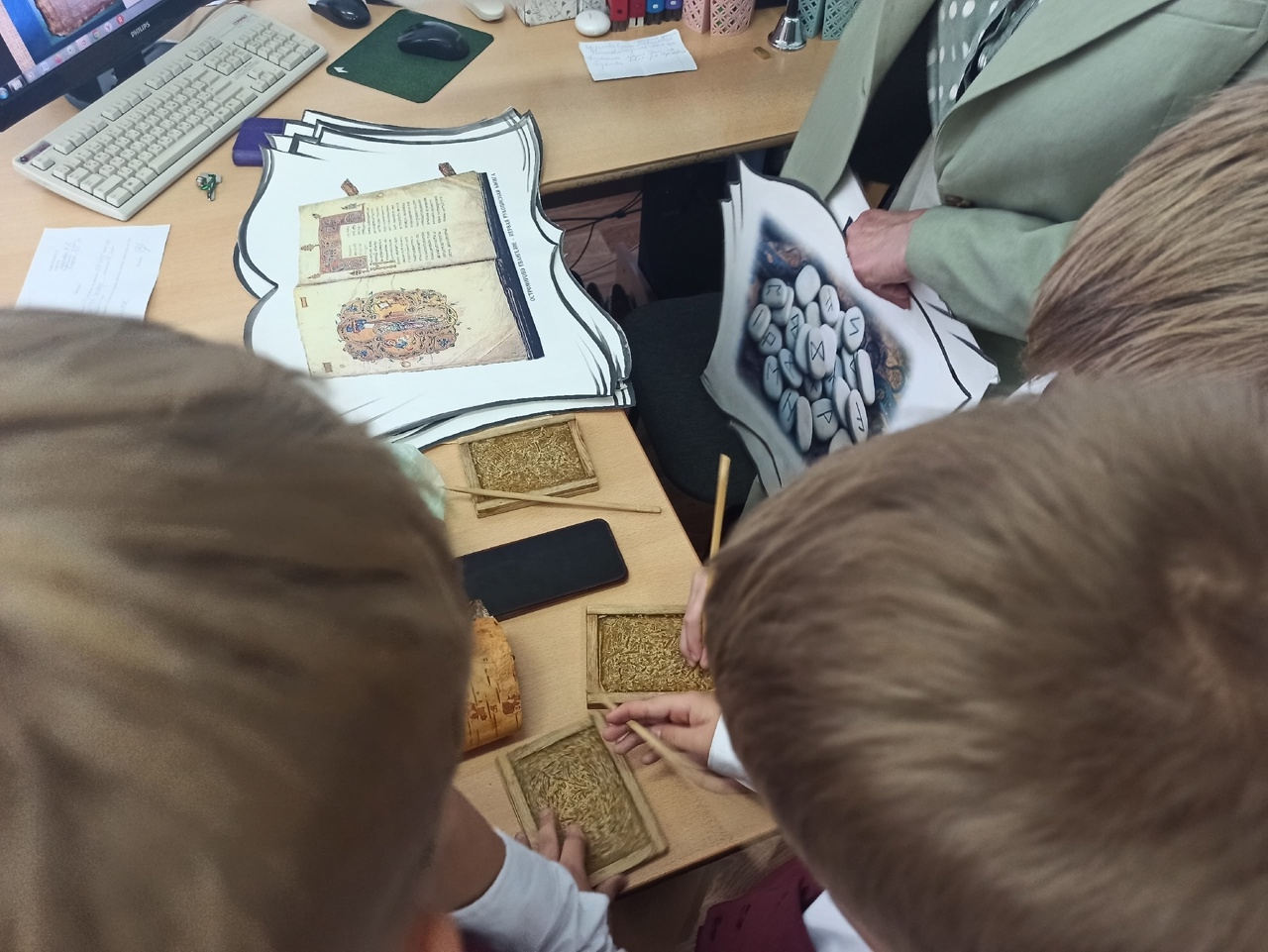 7 октября сотрудники отдела гуманитарной литературы Пушкинки побывали в лицее № 7 с интерактивным уроком «Истоки книги». В мероприятии, участниками которого стали ученики четвертых классов, были задействованы такие наглядные пособия, как египетский папирус, восковые таблички, береста, руны, узелковое письмо, вызвавшие живой интерес и восторженную реакцию школьников.