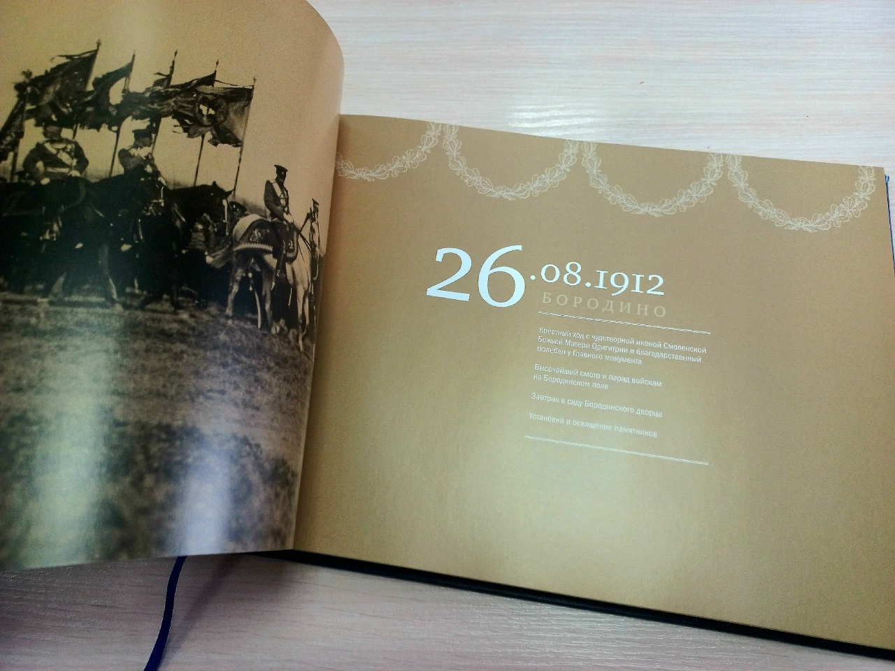 Альбом посвящен юбилейным торжествам в честь 100-летия Отечественной войны 1812 года и Бородинского сражения, состоявшимся в августе 1912 года в высочайшем присутствии. Издание является результатом исторической реконструкции, основанной на документах, фотографических источниках и воспоминаниях современников.