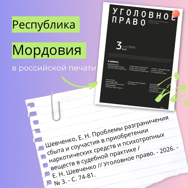 В журнале «Уголовное право» (№ 3 за 2026 год) вышла статья заместителя прокурора Республики Мордовия, кандидата юридических наук Е. Н. Шевченко «Проблемы разграничения сбыта и соучастия в приобретении наркотических средств и психотропных веществ в судебной практике». В публикации рассматриваются проблемы квалификации действий лиц, приобретающих наркотические средства по просьбам потребителей. Исследуются теоретические основания квалификации посредничества как разновидности соучастия в приобретении наркотических средств, так и формы реализационной деятельности. Автором на основе анализа современной судебной практики делается вывод об отсутствии общепризнанных подходов к юридической оценке принадлежности наркотических средств субъектам их незаконного оборота, что создает трудности идентификации фактов их единоличного приобретения посредником с последующим сбытом заказчикам и случаев коллективного присвоения наркотических средств всеми соучастниками группового приобретения. На основе толкования понятия сбыта наркотика как его отчуждения и обоснования возможности совместного им обладания несколькими лицами предлагаются критерии разграничения сбыта и соисполнительства в приобретении наркотических средств.