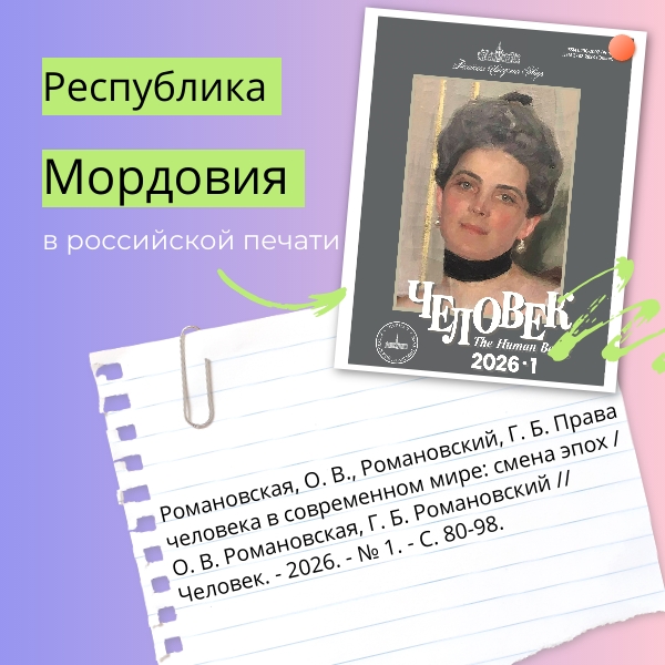 В первом номере журнала «Человек» за 2026 год представлена научная статья О. В. Романовской (Пензенский государственный университет) и Г. Б. Романовского (Средне-Волжский институт (филиал) Всероссийского государственного университета юстиции (РПА Минюста России) в г. Саранске) «Права человека в современном мире: смена эпох», в которой авторы обращаются к ключевым проблемам современной правозащитной деятельности, анализируя риски, которые формируют новое понимание прав человека. Среди них – размывание самого понятия «права человека», отсутствие эффективных ответов на глобальные вызовы со стороны международных институтов, а также противоречия между научным и общественным подходами к правозащитной повестке. Особое внимание уделяется роли неправительственных организаций и их влиянию на формирование повестки. Также в работе поднимается вопрос о влиянии стремительного технологического развития на правовую сферу. Конвергенция нанотехнологий, биотехнологий, информационных и когнитивных наук открывает новые возможности, но одновременно несет серьезные риски: трансформацию правовых принципов, расширение круга субъектов прав и усиление технологического детерминизма.