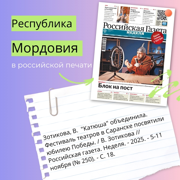 В рамках проекта «Республика Мордовия в российской печати» отдел периодических изданий продолжает знакомить с публикациями о нашей республике, а также региональных авторов, размещенными на страницах федеральных изданий.