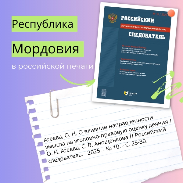 В научно-практическом и информационном журнале «Российский следователь» № 10 за 2025 год размещена статья О. Н. Агеевой и С. В. Анощенковой «О влиянии направленности умысла на уголовно-правовую оценку деяния». В публикации авторами определена категория «направленность умысла», на основе изучения судебной практики выявлено значение направленности умысла для толкования и применения уголовно-правовых норм.