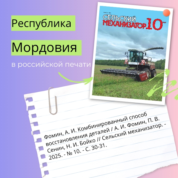 Авторами Мордовского государственного университета им. Н. П. Огарёва – А. И. Фоминым, П. В. Сениным и Н. И. Бойко – в публикации «Комбинированный способ восстановления деталей» предложена технология восстановления поверхностей валов комбинированием способов. Цилиндрическая часть вала восстанавливается электpоконтактной приваркой, а зона кромки электродуговой наплавкой в защитной среде с обязательным «захватом» края приваренной ленты. Данную статью можно найти в октябрьском номере журнала «Сельский механизатор» за 2025 год.
