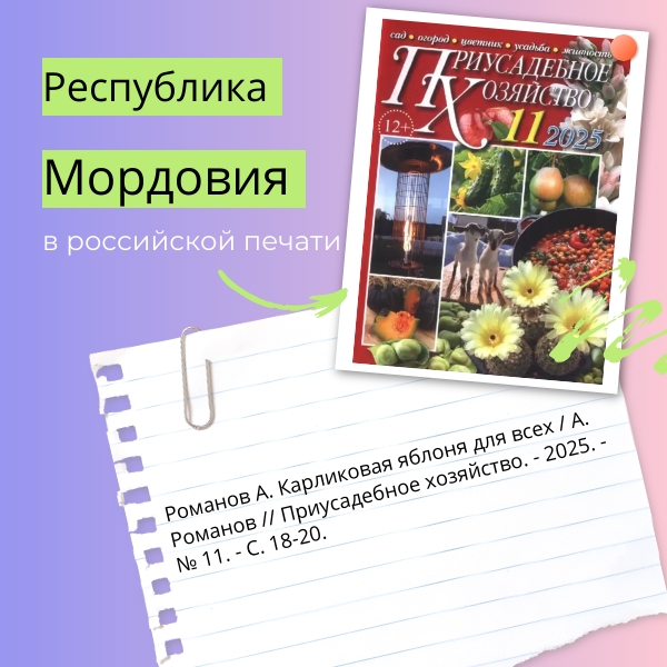Многим хотелось бы выращивать карликовые яблони. Они красивы и занимают мало места, быстро вступают в плодоношение, за ними удобно ухаживать. Но везде ли в России можно посадить такие? Обычно карликовые подвои отлично чувствуют себя на юге, на севере с ними сложнее. Садовод А. Романов из Мордовии в своей публикации «Карликовая яблоня для всех» делится опытом и результатами выращивания карликовых яблонь.  Материал размещен на страницах журнала «Приусадебное хозяйство» № 11 за 2025 год.