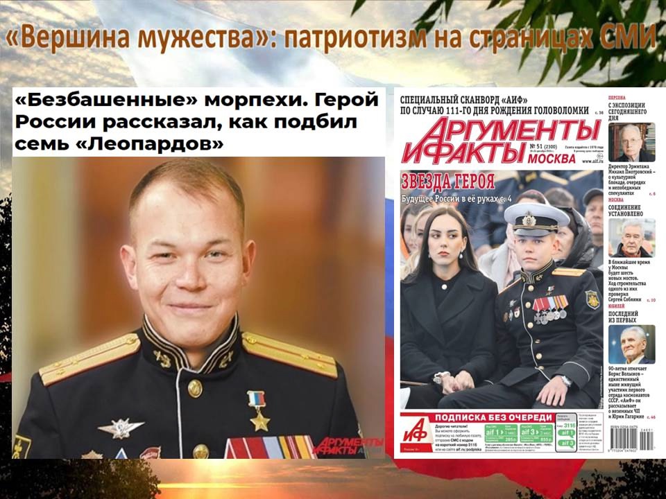 В рамках интернет-проекта «Вершина мужества» отдел периодических изданий подготовил подборку статей, которые познакомят читателей с информацией о подвигах наших солдат – участников СВО. Предлагаем ознакомиться с материалами из газет «Аргументы и факты» и «Российская газета».