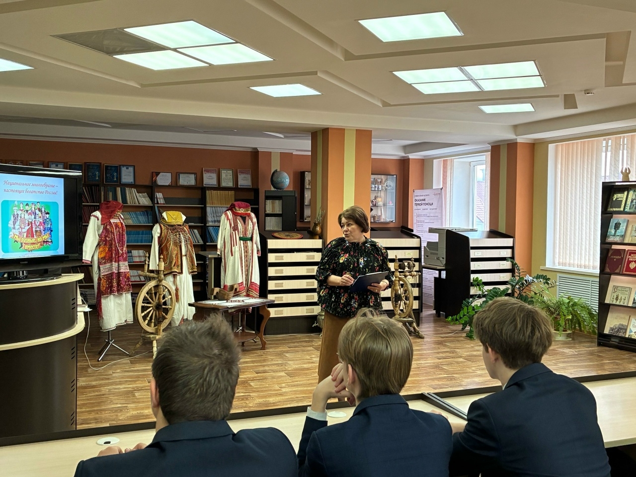 Сотрудники отдела национальной и краеведческой литературы продолжают цикл национально-культурных мероприятий, в рамках которого проходят этночасы, исторические, просветительские, краеведческие лектории и т. д. Для учащихся гимназии № 19 г. о. Саранск был организован исторический лекторий «Мордовия многонациональная», приуроченный к Году единства народов России. Библиотекари рассказали учащимся о народах, проживающих на территории нашей республики, отметили их историю, культуру, обычаи и традиции.