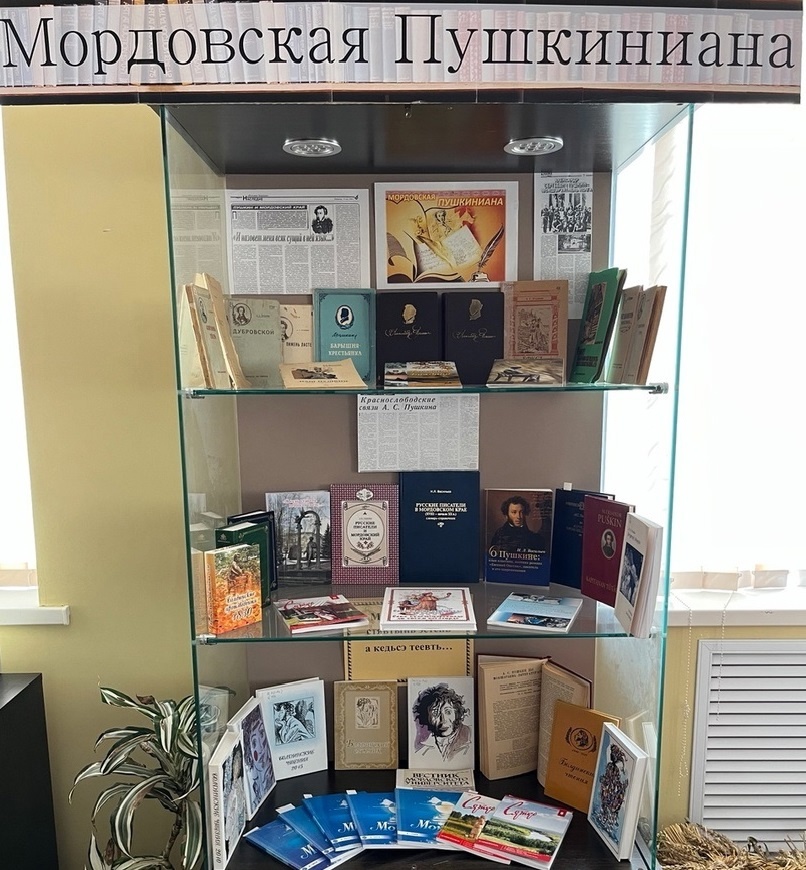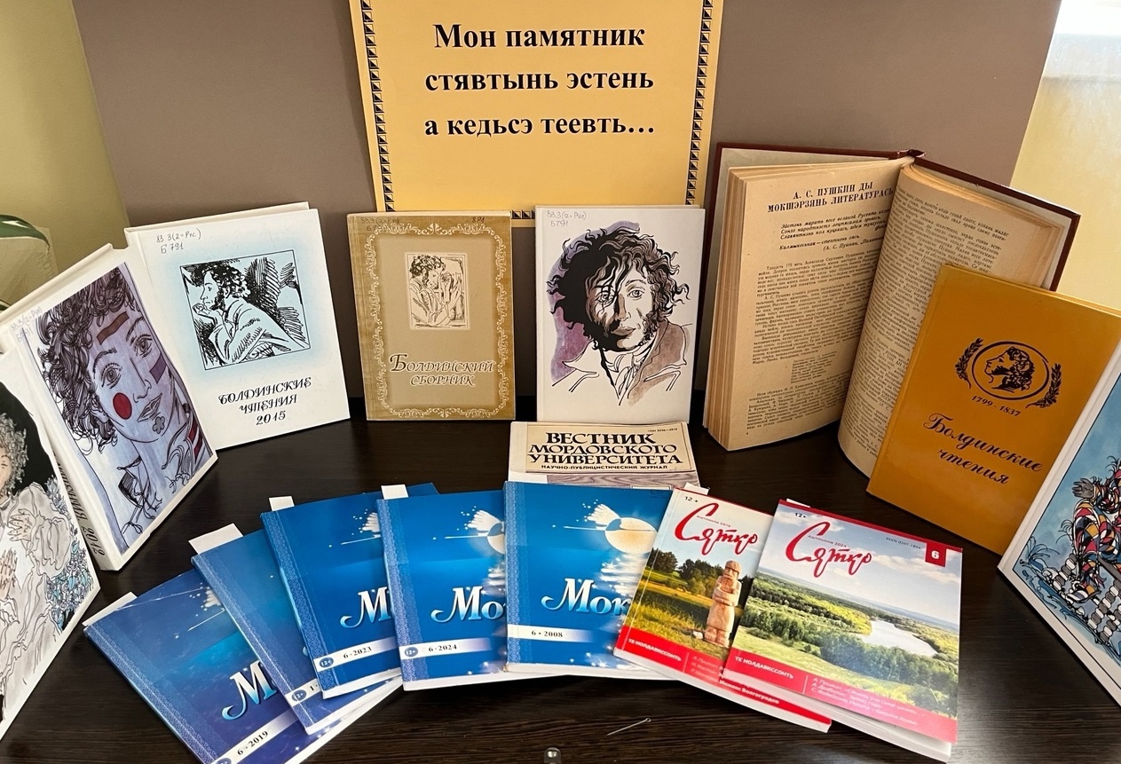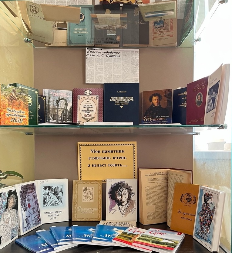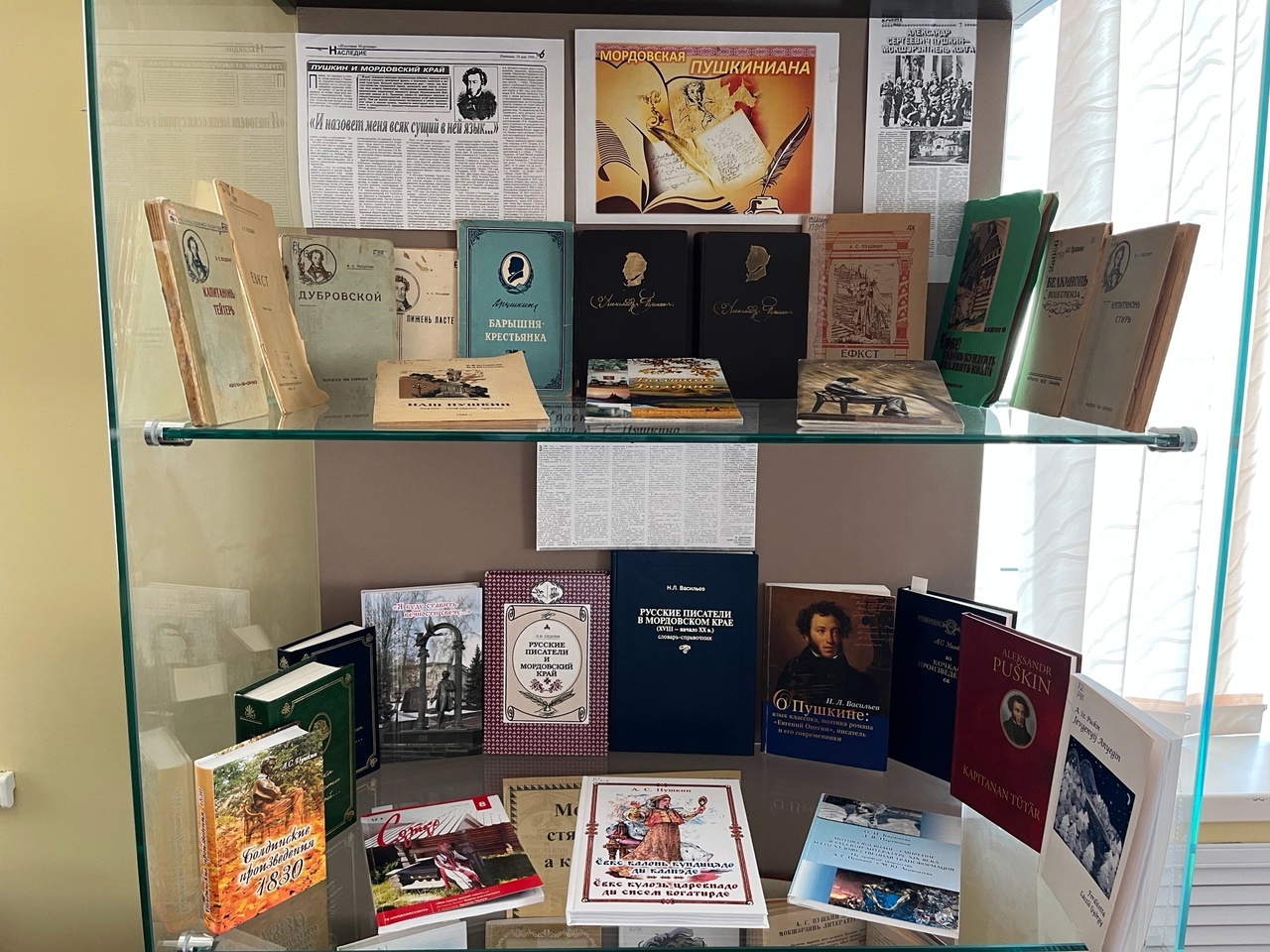 В экспозиции представлена литература о жизни и творчестве поэта, опубликованная в Мордовии, произведения А. С. Пушкина, изданные на мокшанском и эрзянском языках. Особое место занимают избранные произведения 1947 года издания, куда вошли известные стихи, поэмы на мордовских языках.