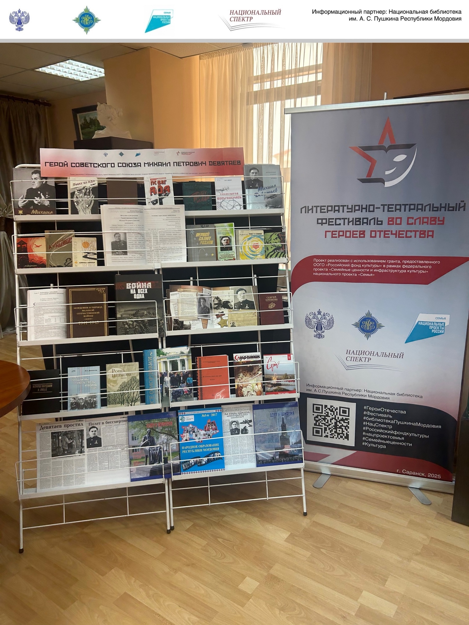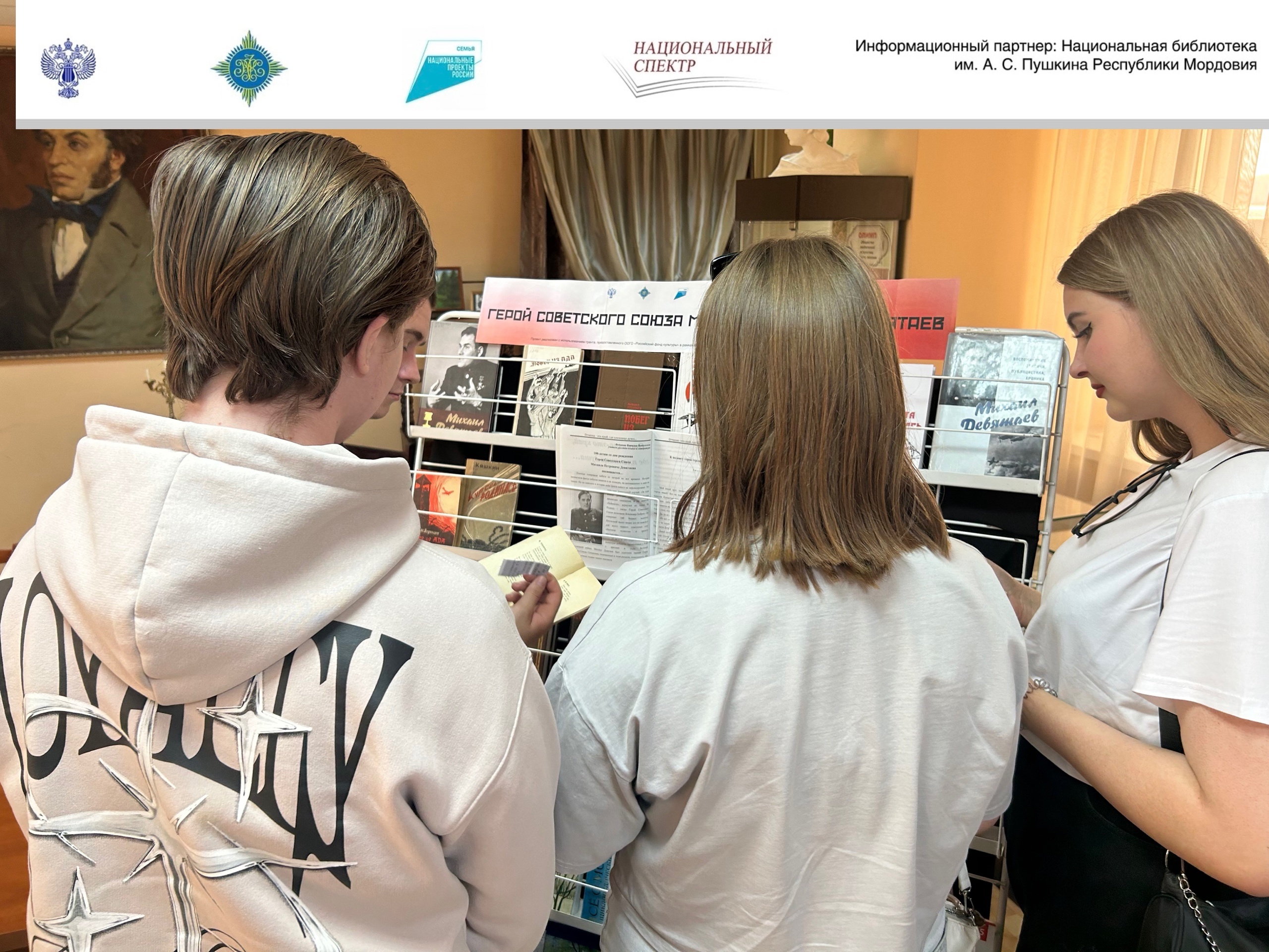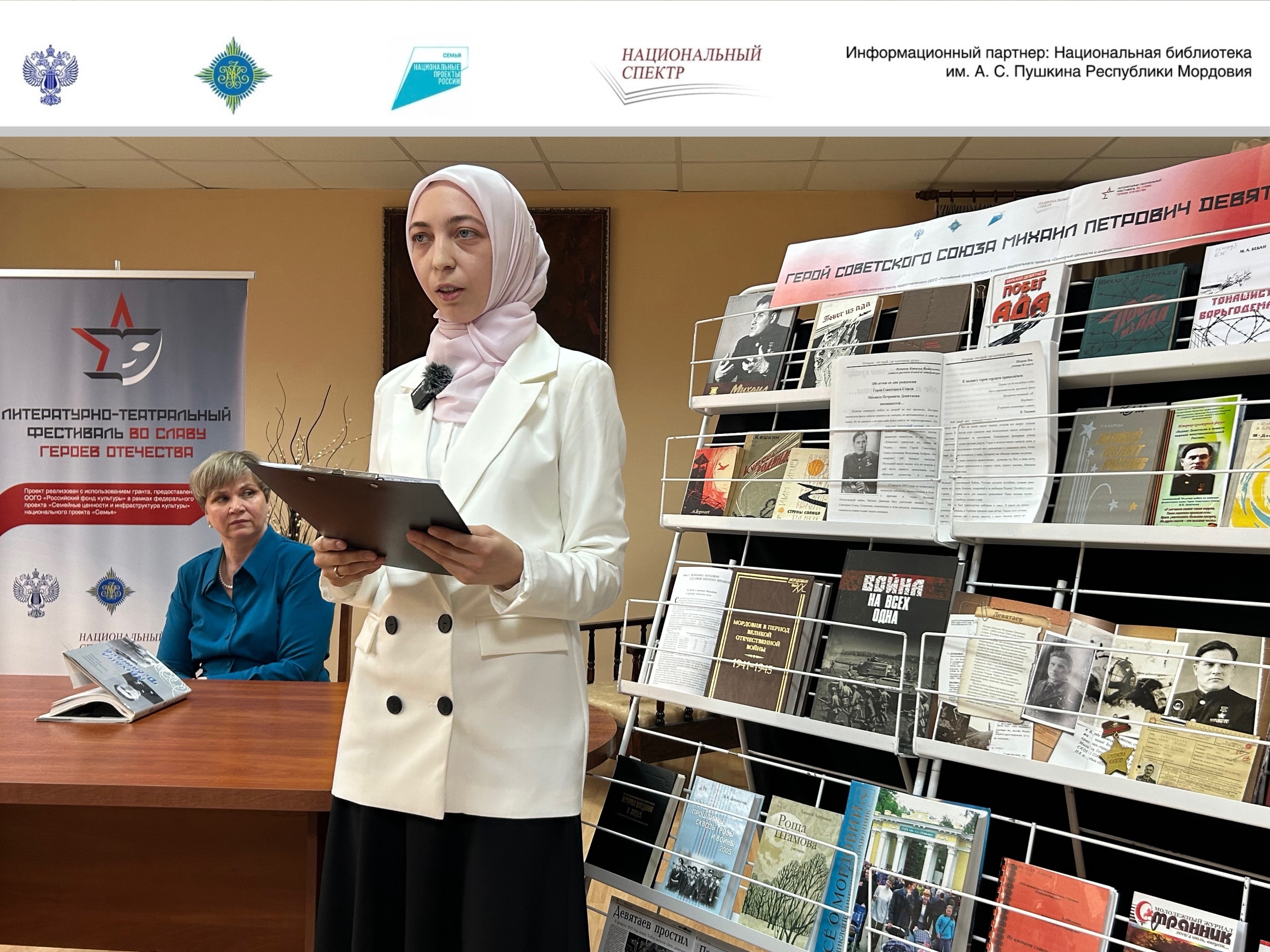 В рамках проекта «Литературно-театральный фестиваль “Во славу героев Отечестваˮ», реализуемого Ассоциацией издателей «Некоммерческое партнерство “Национальный спектрˮ» с использованием гранта, предоставленного ООГО «Российский фонд культуры» в рамках федерального проекта «Семейные ценности и инфраструктура культуры» национального проекта «Семья», в Национальной библиотеке им. А. С. Пушкина Республики Мордовия состоялась литературно-патриотическая встреча «Герой Советского Союза Михаил Петрович Девятаев».