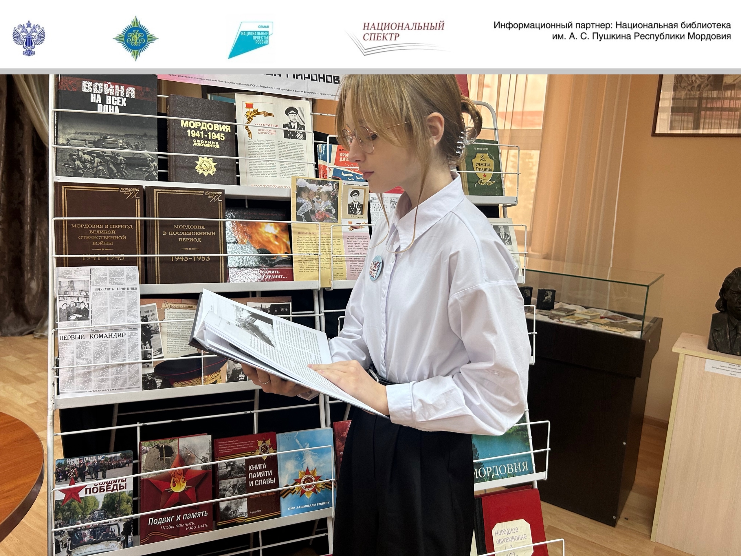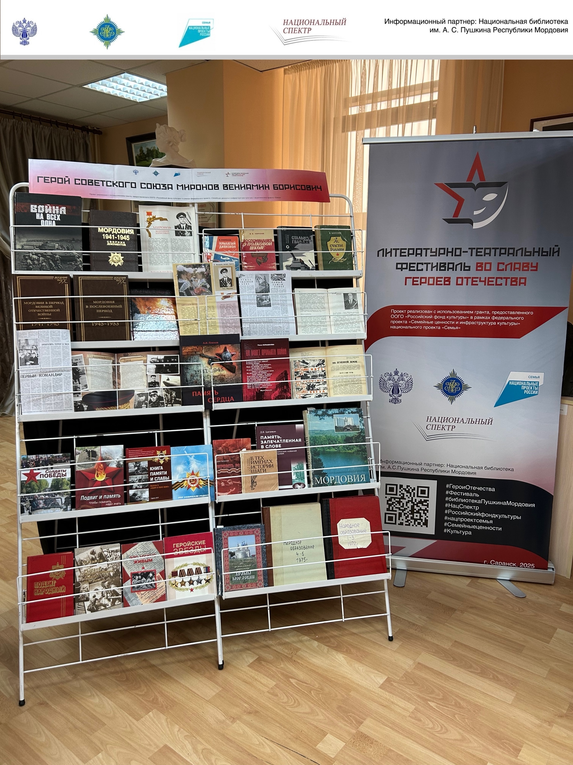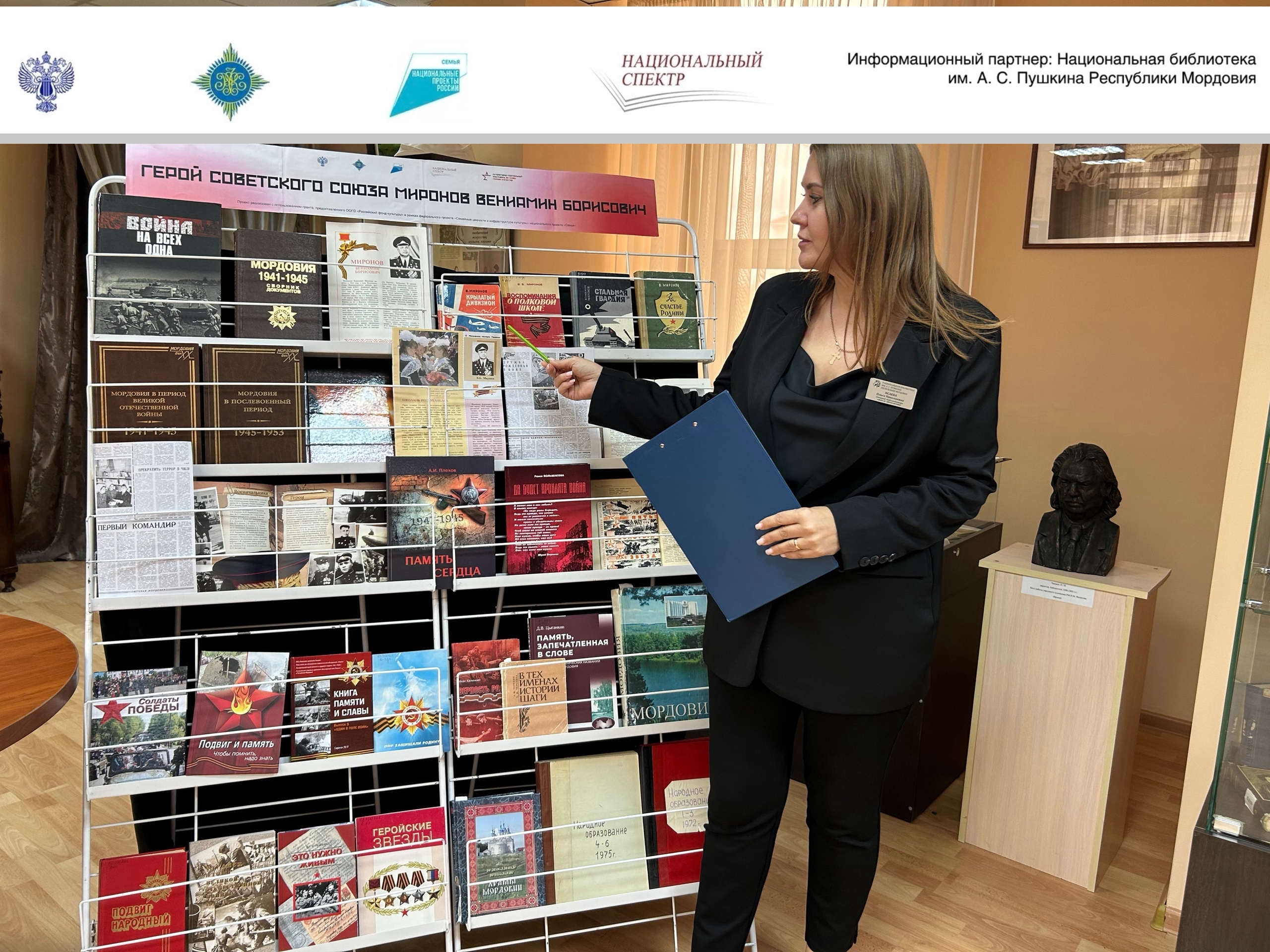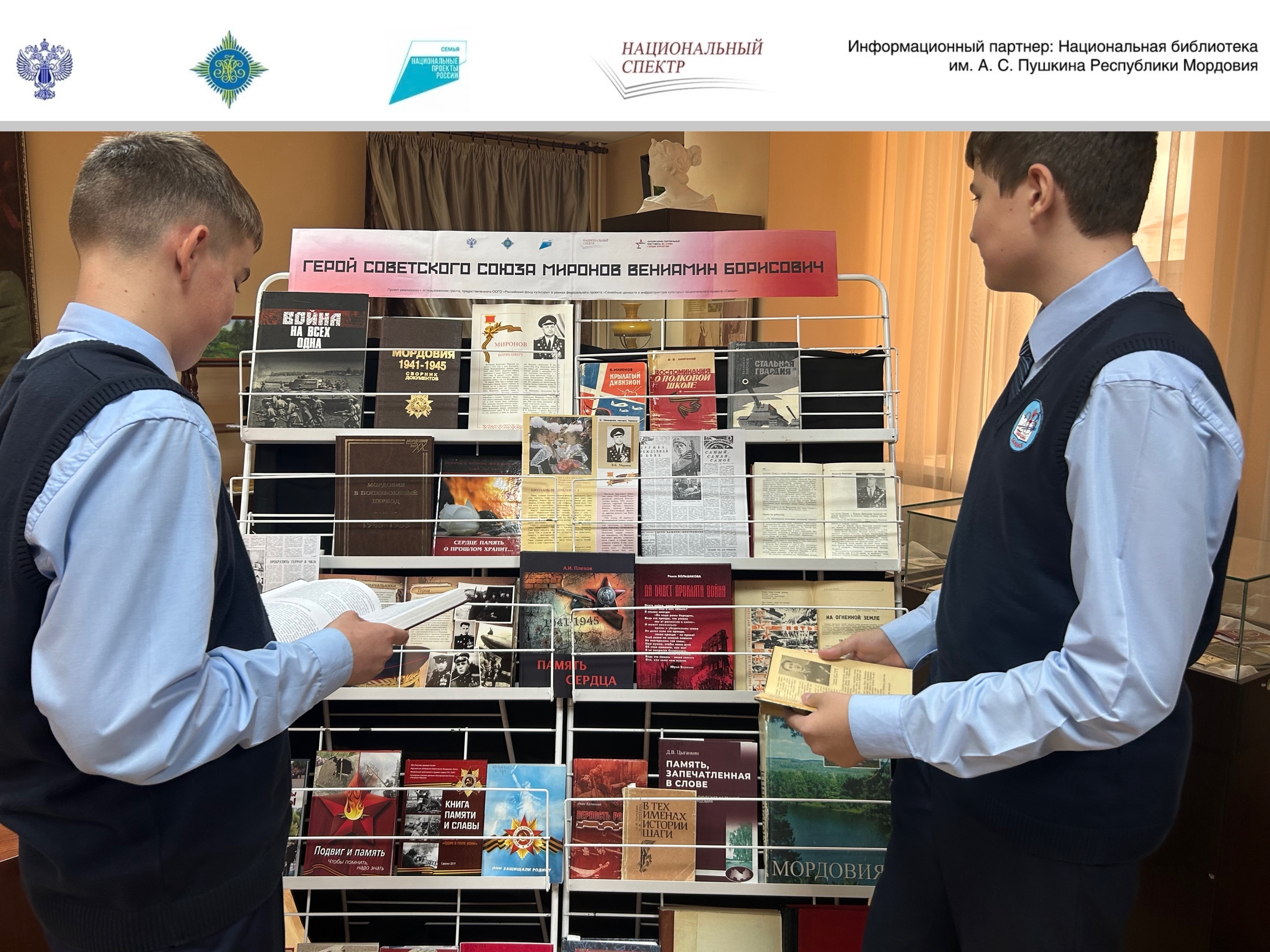 В рамках проекта «Литературно-театральный фестиваль “Во славу героев Отечестваˮ», реализуемого Ассоциацией издателей «Некоммерческое партнерство “Национальный спектрˮ» с использованием гранта, предоставленного ООГО «Российский фонд культуры» в рамках федерального проекта «Семейные ценности и инфраструктура культуры» национального проекта «Семья», в Национальной библиотеке им. А. С. Пушкина Республики Мордовия состоялась литературно-патриотическая встреча «Герой Советского Союза Миронов Вениамин Борисович».