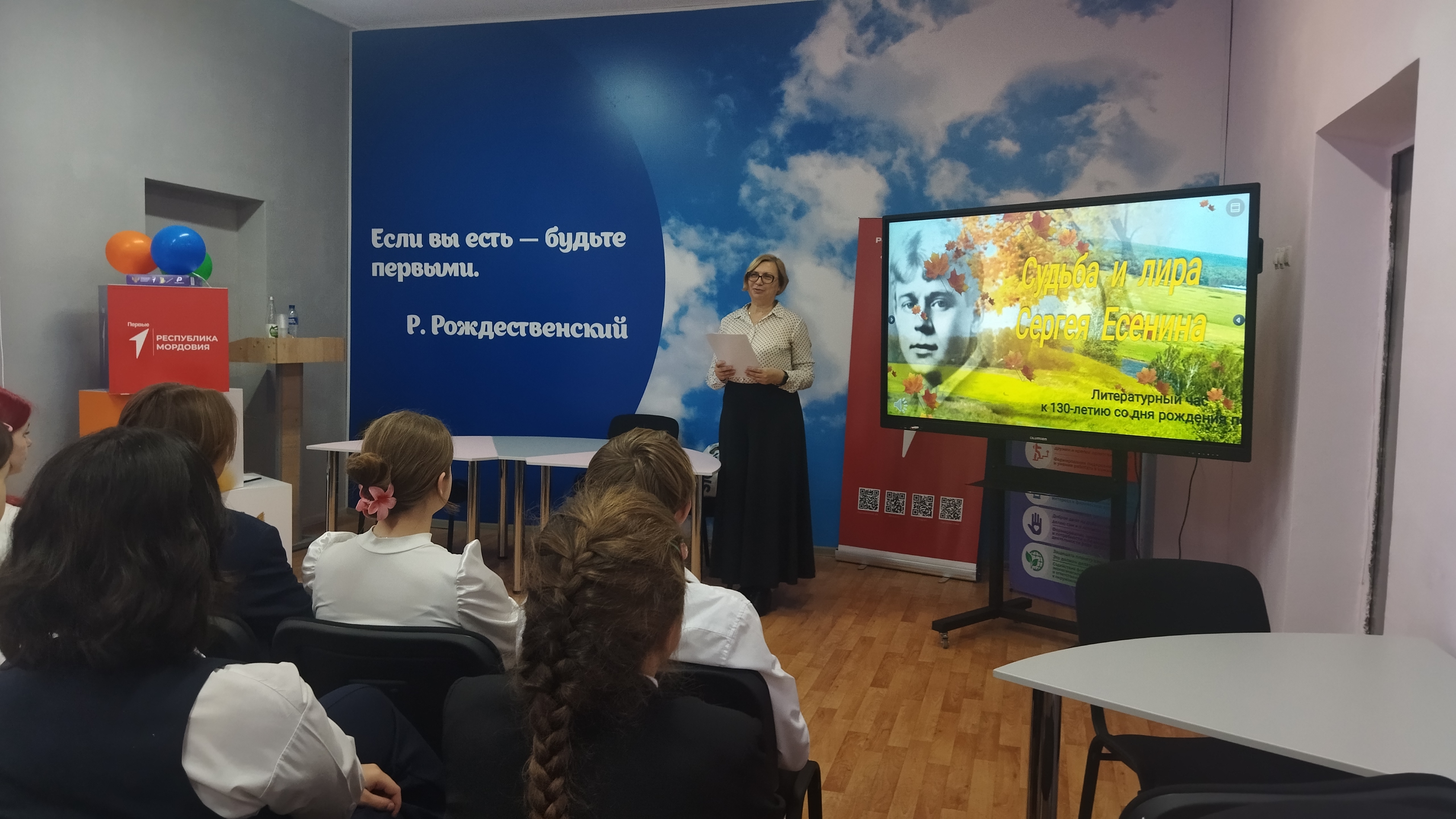 Для девятиклассников библиотекари провели литературный час, посвященный 130-летию со дня рождения Сергея Есенина, и литературную встречу из цикла культурно-просветительских мероприятий о славных людях земли мордовской (в рамках празднования 95-летия Мордовской автономии).