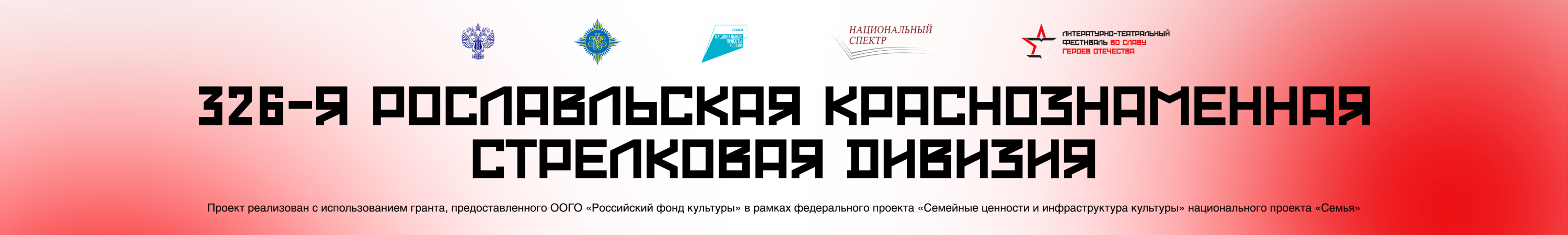 Ассоциация издателей «Некоммерческое партнерство “Национальный спектр”» реализует проект «Литературно-театральный фестиваль “Во славу героев Отечества”» с использованием гранта, предоставленного ООГО «Российский фонд культуры» в рамках федерального проекта «Семейные ценности и инфраструктура культуры» национального проекта «Семья».