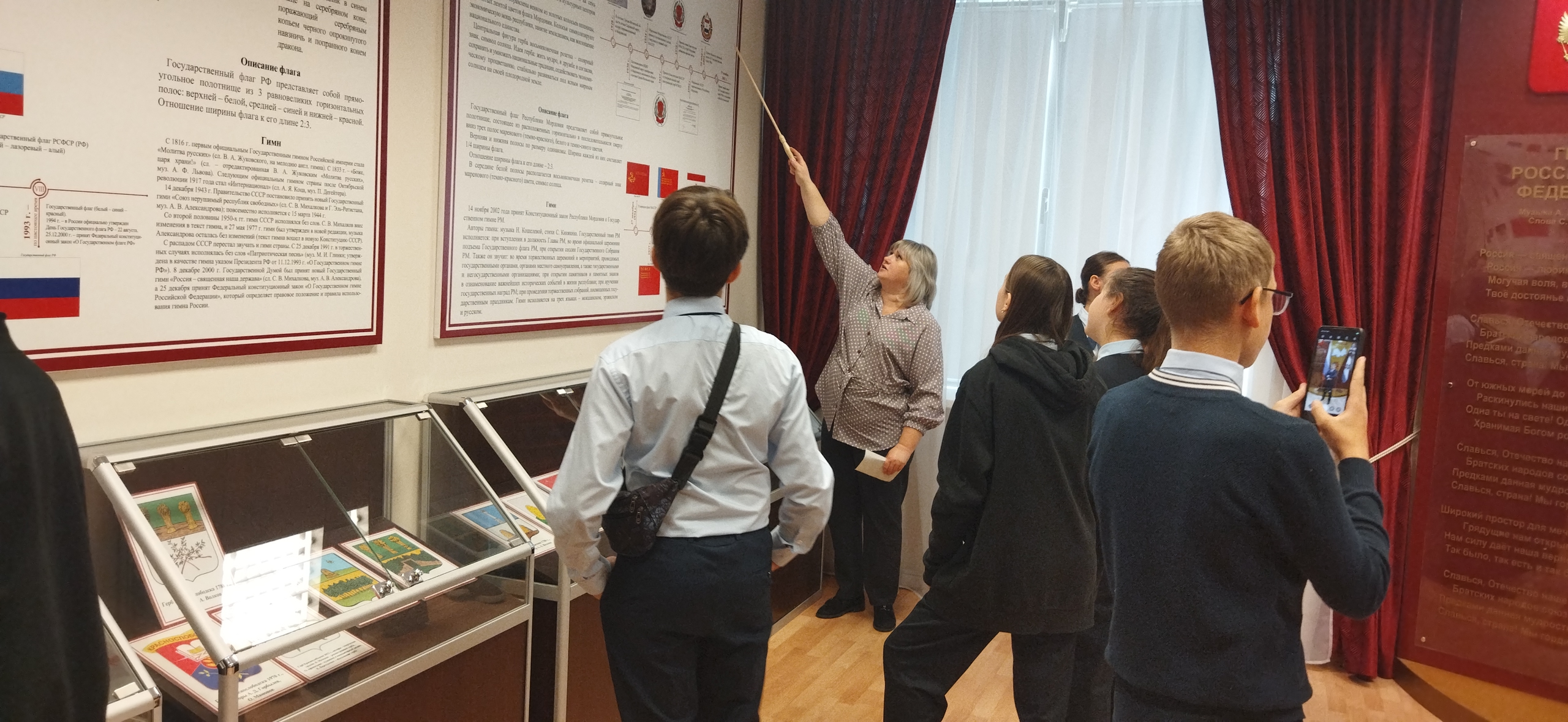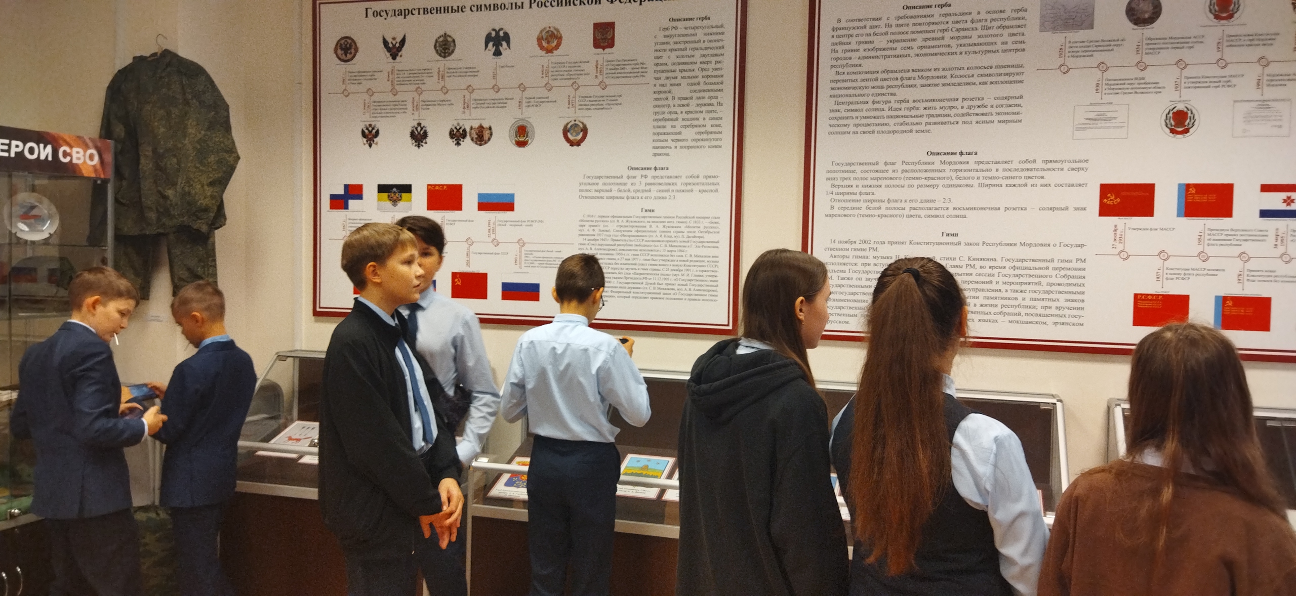 Далее для гостей провели экскурсию по Залу государственной символики. Школьники с неподдельным интересом слушали историю государственных символов Российской Федерации. Кроме того, присутствующим рассказали о гербе и флаге Мордовии и символике городов и муниципальных районов нашей республики.