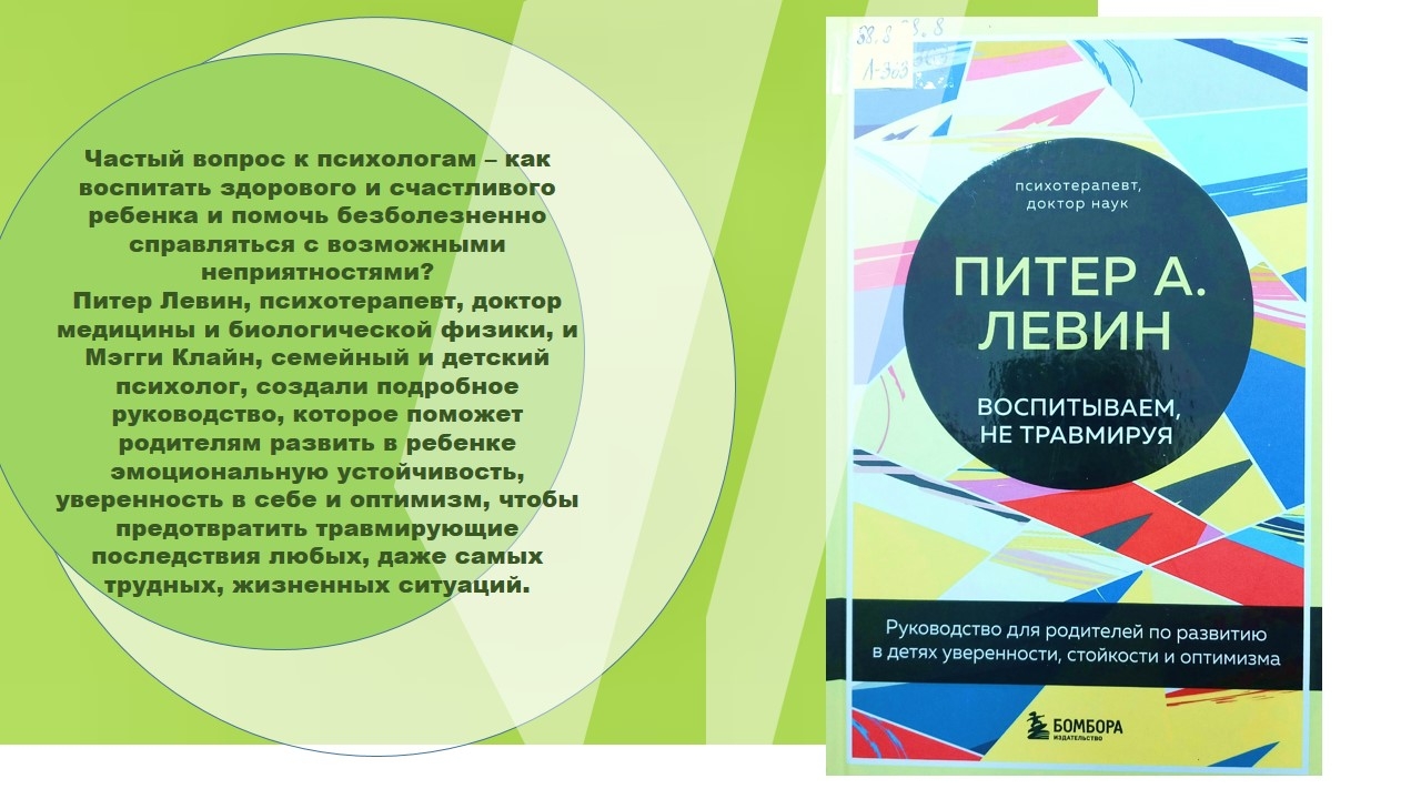 Левин, Питер А. Воспитываем, не травмируя : руководство для родителей по развитию в детей уверенности, стойкости и оптимизма / Питер А. Левин, Мэгги Клайн ; [перевод с английского Е. Цветковой]. – Москва : Эксмо, 2025. – 320 с. – ISBN 978-5-04-119622-6. – Текст : непосредственный.