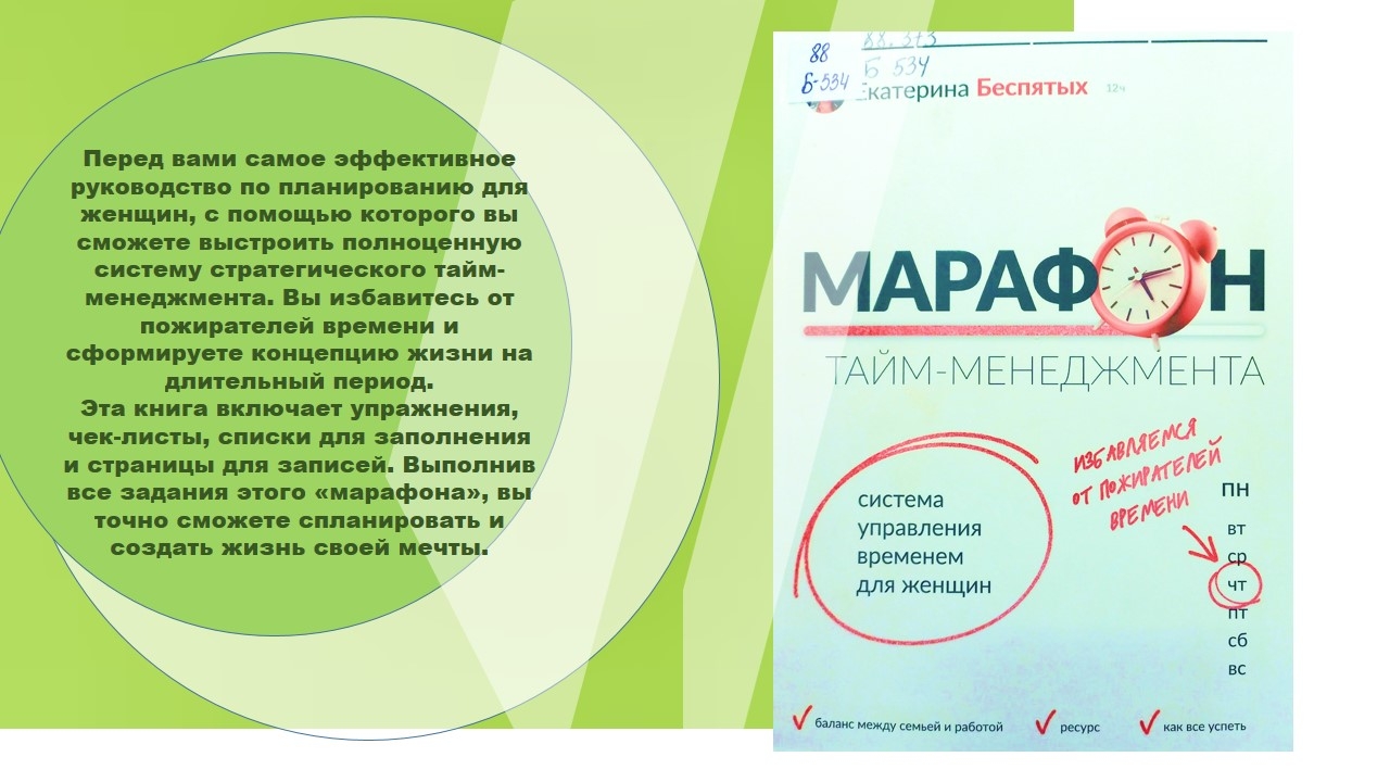 Беспятых, Е. Марафон тайм-менеджмента. Система управления временем для женщин / Екатерина Беспятых. – Москва : Издательство АСТ, 2023. – 256 с. – (Тренинг-марафон). – ISBN 978-5-17-153921-4. – Текст : непосредственный.