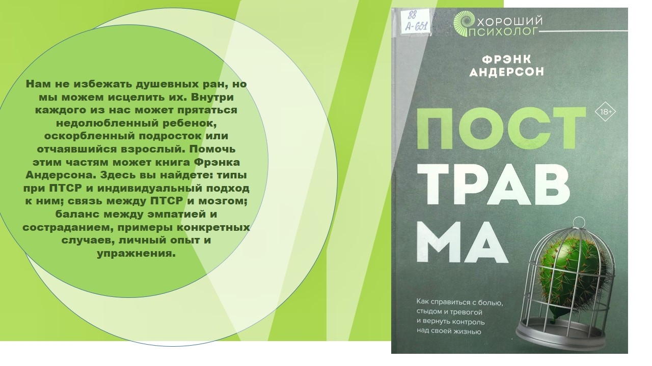 Андерсон, Фрэнк. Посттравма. Как справиться с болью, стыдом и тревогой и вернуть контроль над своей жизнью = ПТСР. Руководство по проработке психологических травм / Фрэнк Андерсон : [перевод с английского Д. Н. Лемешко]. – Москва : Издательство АСТ : Кладезь, 2024. – 352 с. – ISBN 978-5-17-158227-2. – Текст: непосредственный.