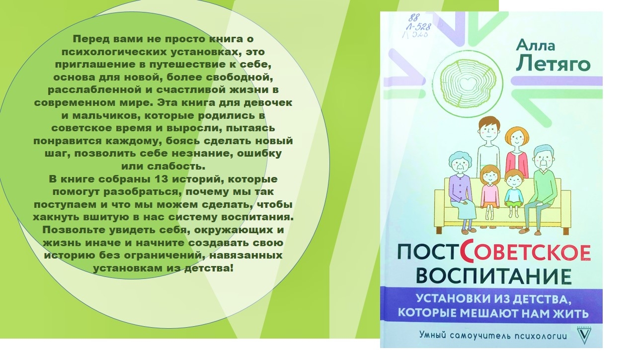 Летяго, Алла. Постсоветское воспитание: установки из детства, которые мешают нам жить / Алла Летяго. – Москва : Издательство АСТ, 2025. – 224 с. – (Умный самоучитель психологии). – ISBN 978-5-17-166790-0. – Текст : непосредственный.