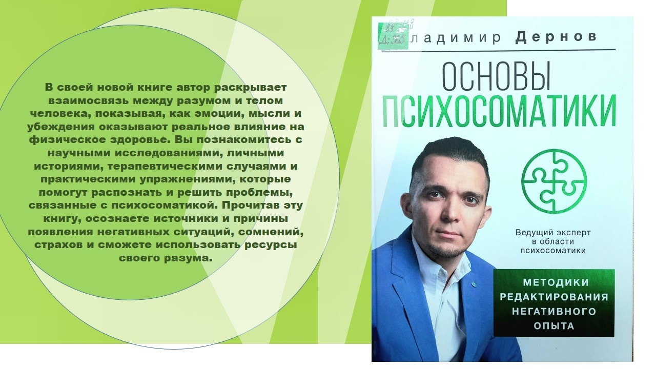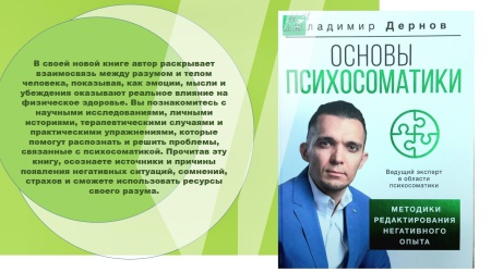 Дернов, В. Основы психосоматики : методики редактирования негативного опыта / Владимир Дернов. – Москва : Издательство АСТ, 2023. – 240 с. – (Здоровье Рунета). – ISBN 978-5-17-48456. – Текст : непосредственный.