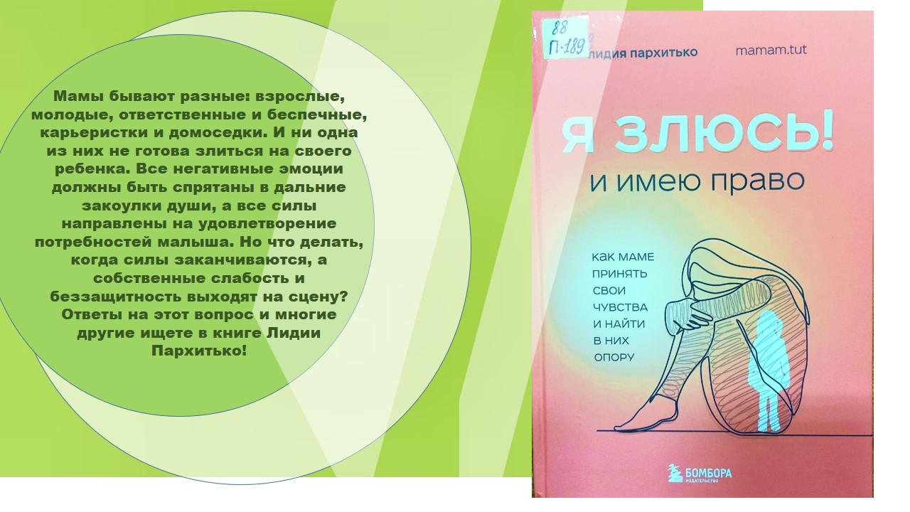 Пархитько, Л. Я злюсь! И имею право. Как маме принять свои чувства и найти в них опору / Лидия Пархитько. – Москва : Эксмо, 2024. – 304 с. – (Мама online. Книги для современных родителей). – ISBN 978-5-04-104346-6. – Текст : непосредственный.