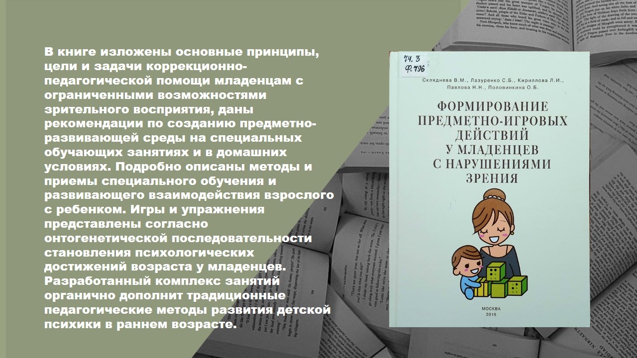Скляднева, В. М. Формирование предметно-игровых действий у младенцев с нарушением зрения / В. М. Скляднева, С. Б. Лазуренко, Л. И. Кириллова, Н. Н. Павлова, О. Б. Половинкина. – Москва : АдамантЪ, 2015. – 184 с. – ISBN 978-5-86103-156-1. – Текст : непосредственный.