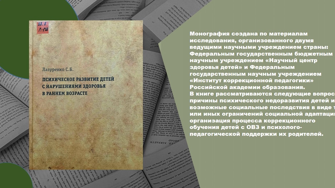 Лазуренко, С. Б. Психическое развитие детей с нарушениями здоровья в раннем возрасте. Монография / С. Б. Лазуренко. – Москва : ЛОГОМАГ, 2015. – 256 с. – ISBN 978-5-905025-33-4. – Текст : непосредственный.